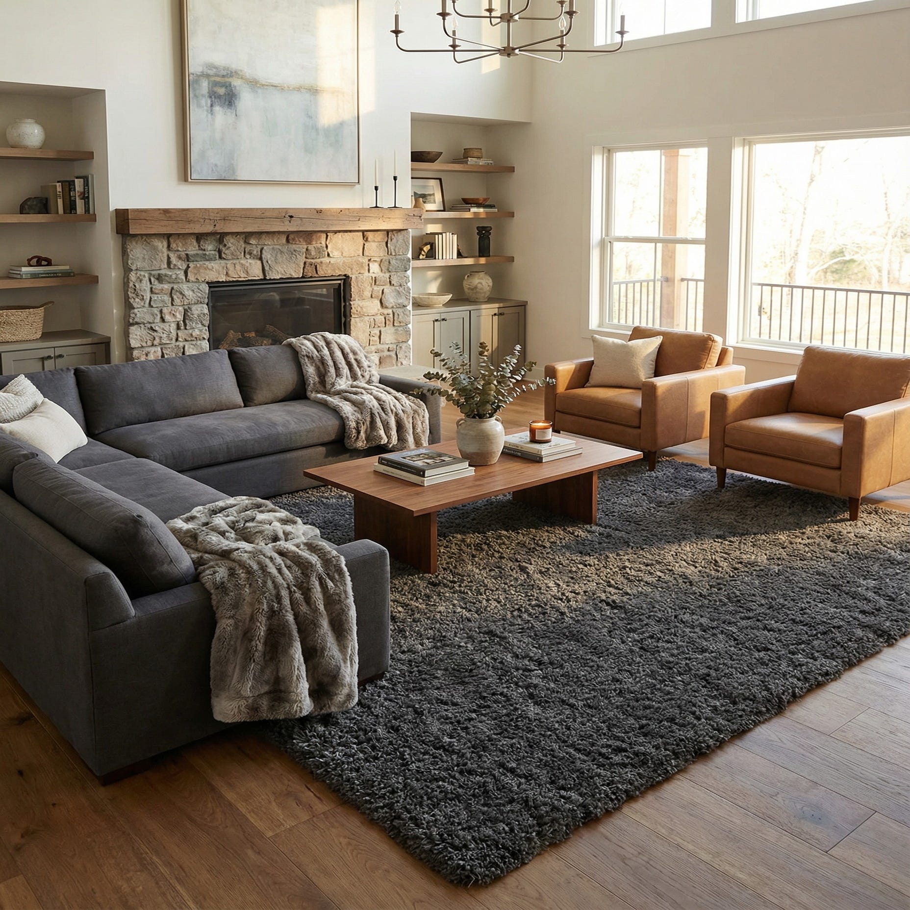 Place this rug in a contemporary living room to anchor a sectional, under a bed to add soft warmth, or in a media room to soften acoustics and seating areas. It pairs well with light or dark woods, matte metal accents, and layered textiles—use it to add depth in minimalist spaces or to balance industrial finishes with a softer touch.