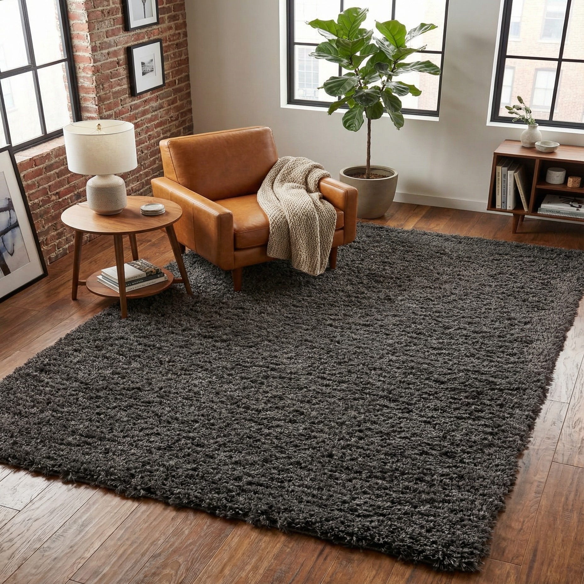 A deep, even shag in a slate hue gives this rug a quietly modern presence. The surface is made up of long, densely packed polyester fibers that lift from the backing to create a soft, pillowy feel underfoot and a subtly textured look across the field. The uniform, solid pattern keeps the visual focus on the plush pile and the rich, cool-gray tone, making it easy to pair with a variety of finishes and furnishings.