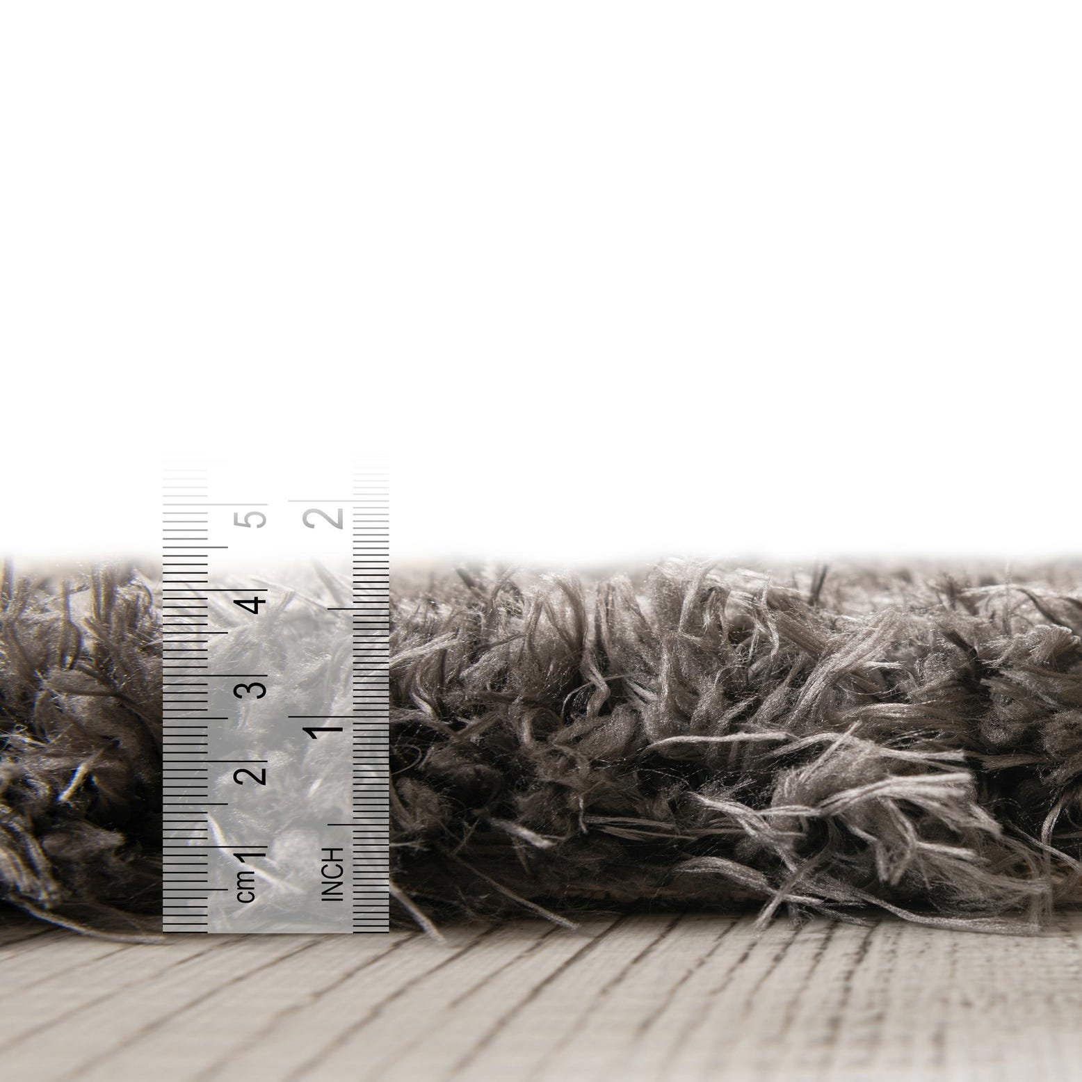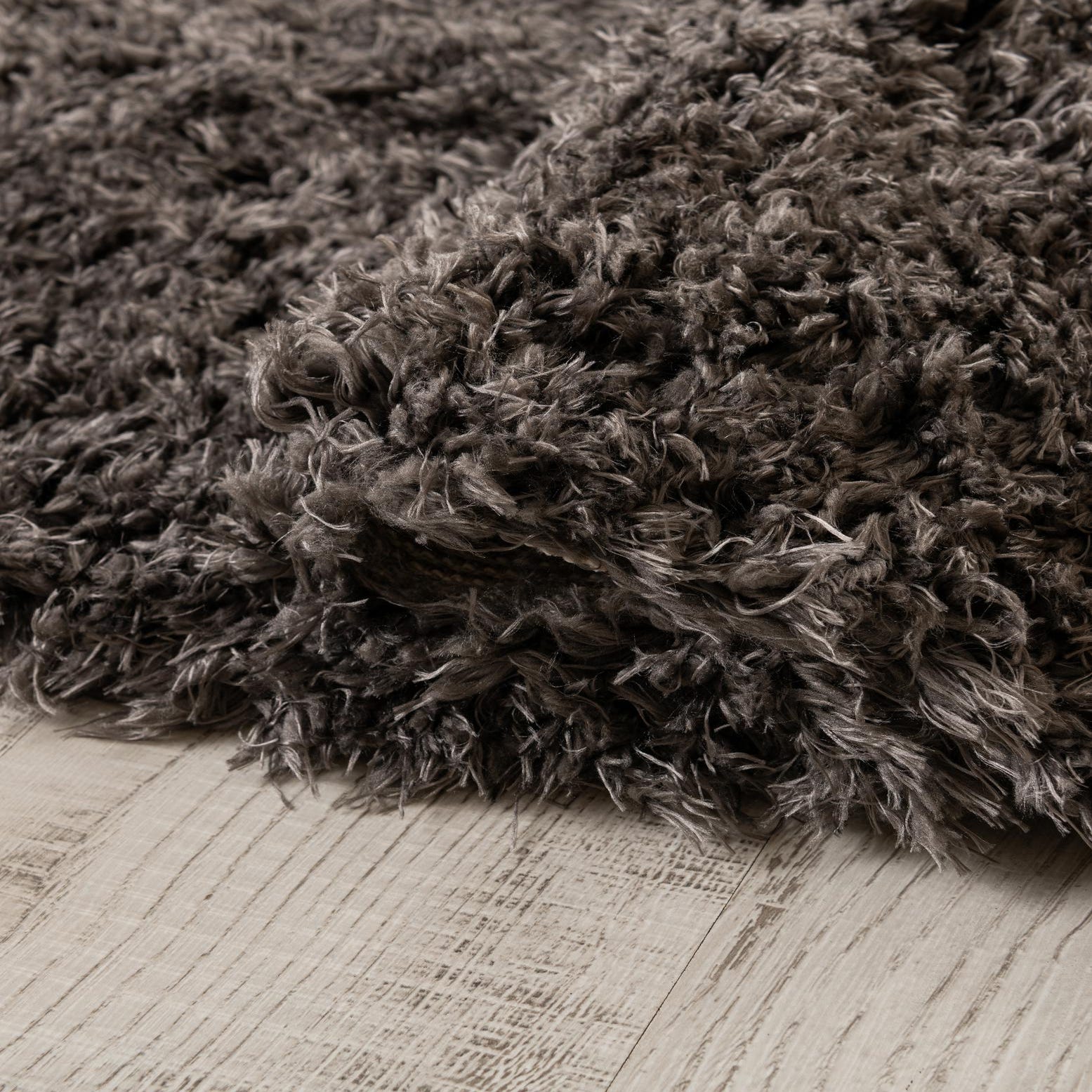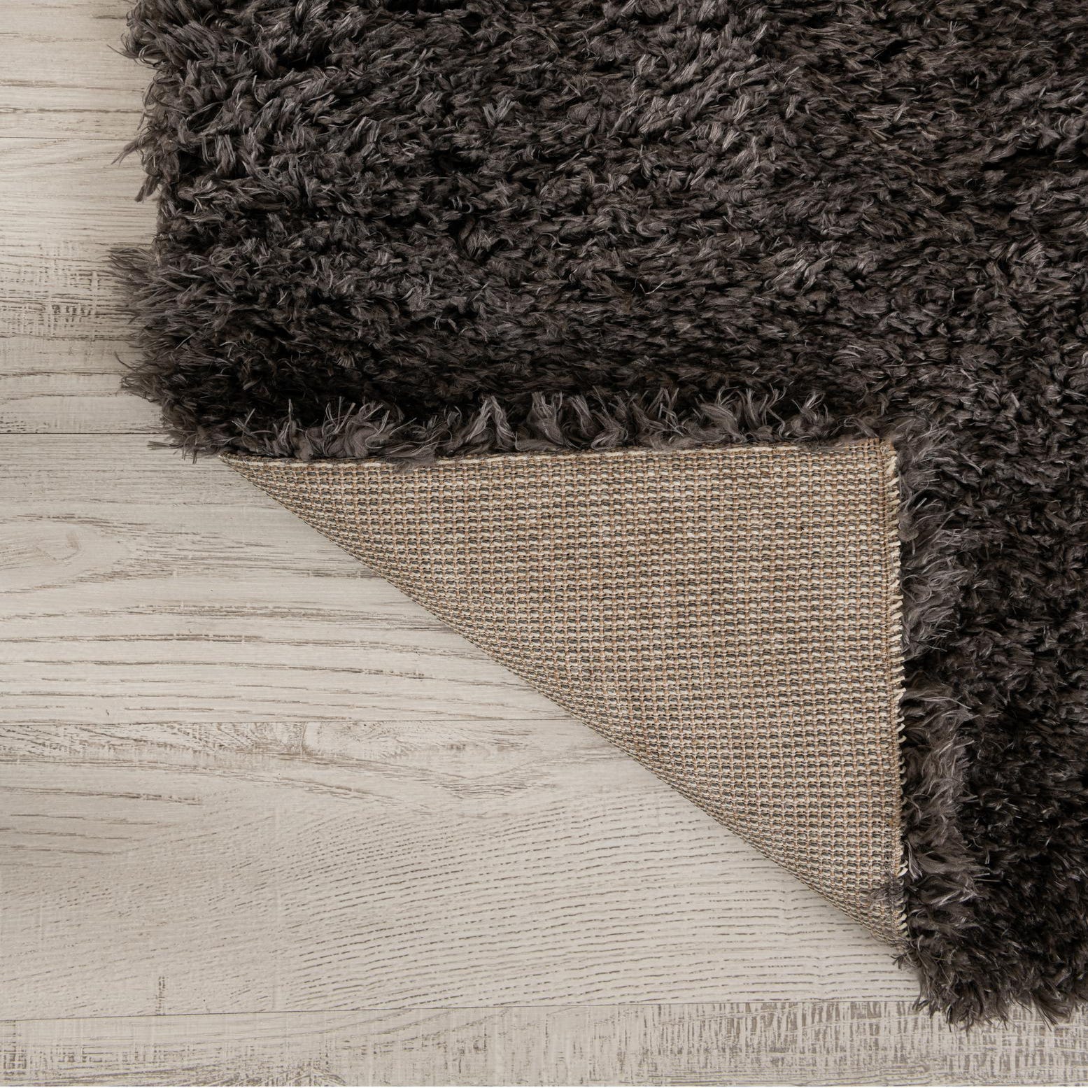A machine-made shag crafted from 100% polyester in a slate background, this rug presents a clean, monochrome surface with a deep, high pile. The design is intentionally minimal — no printed pattern, just rich, dense fibers that create a soft, cushiony feel underfoot and a subtle tonal depth across the field. The long pile gives the surface a tactile dimension that invites touch while keeping the overall look calm and understated.