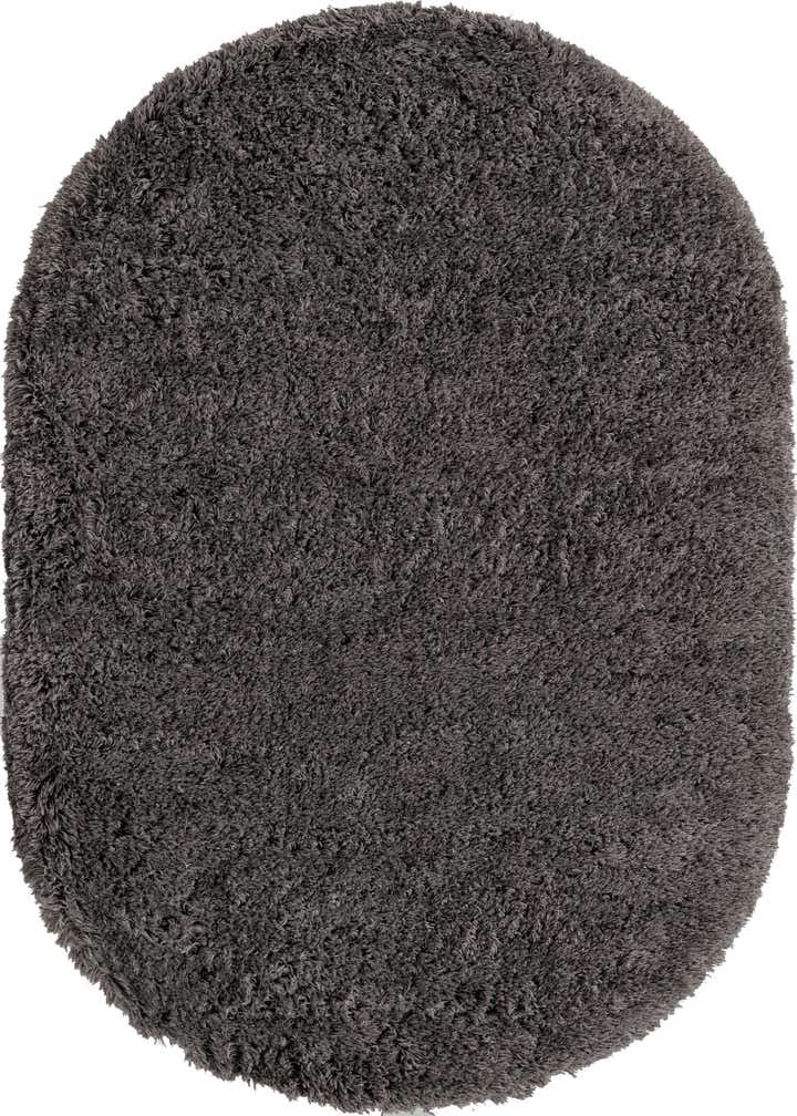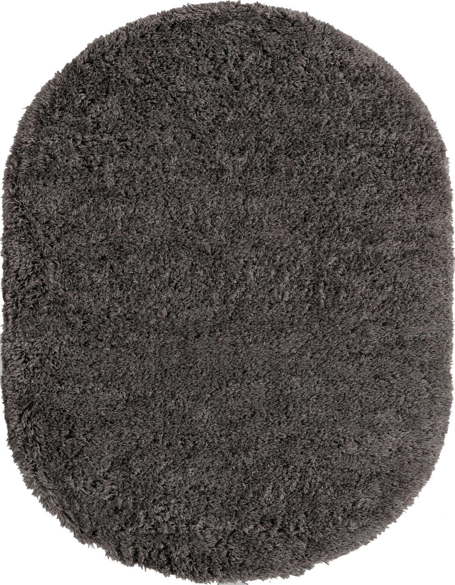 Oval in silhouette and finished in a rich slate, this shag rug presents a clean, solid field of long, densely packed polyester fibers. The high-pile construction offers a noticeably plush hand and a soft, slightly lustrous surface that invites bare feet. Machine-made from 100% polyester, the rug’s even pile creates a uniform texture and a cozy visual anchor without any printed or woven pattern.