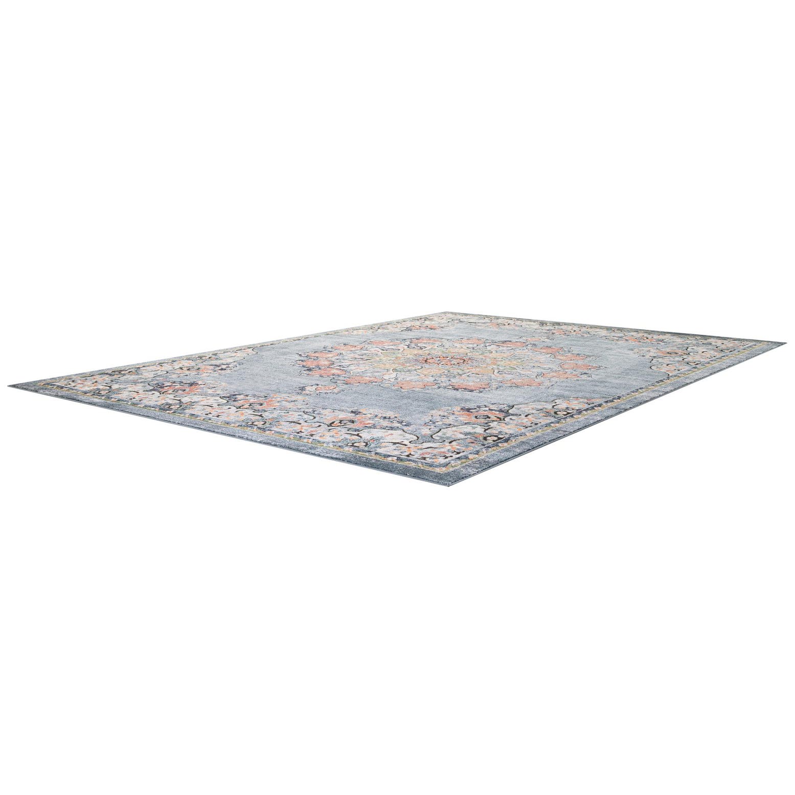 A large 10x14 rectangular blue area rug with an elaborate central medallion and ornate floral border in shades of blue, orange, and cream.