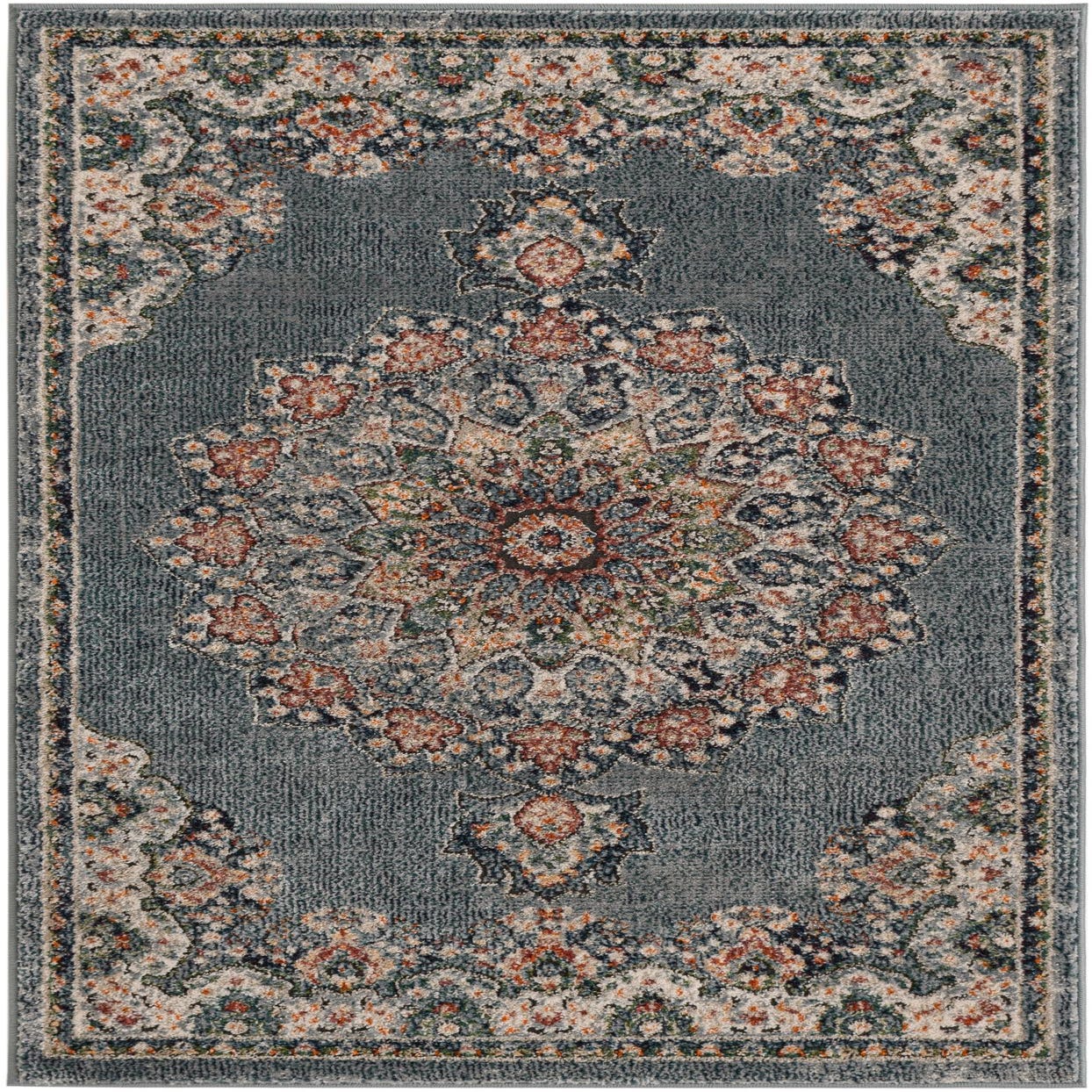 Primary color is Slate Blue. Colors in this rug include: Slate Blue, Beige, Black, Green, Ivory, Light Blue, Navy Blue, Orange, Rust Red.