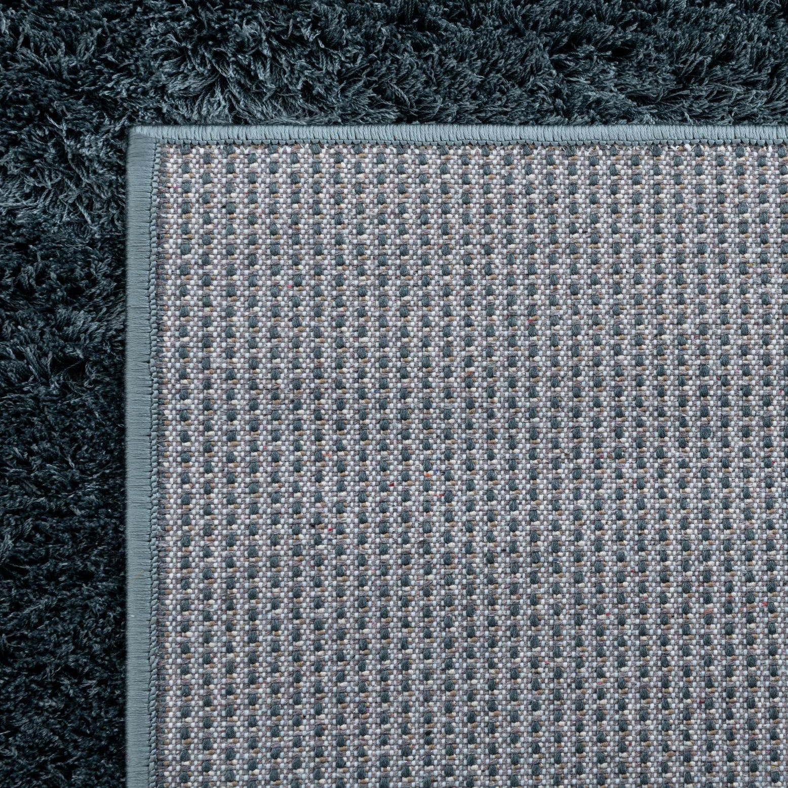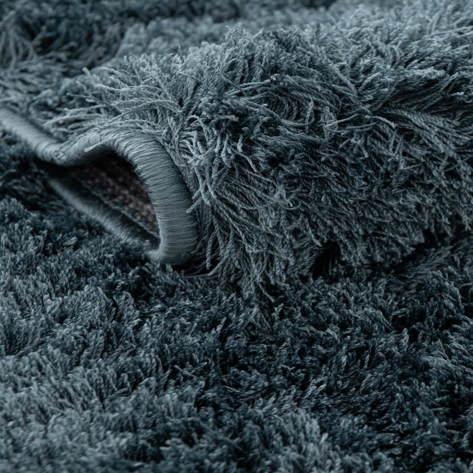 A solid-field shag in slate blue, this rug presents a single, even surface of long, dense fibers that read as a calm, cool expanse of color. The machine-made construction in 100% polyester gives the pile a soft, cushiony hand and a slight, satiny sheen where the light catches the tips. Running your fingers across it reveals a plush, almost cloud-like texture with a steady, resilient feel beneath foot.