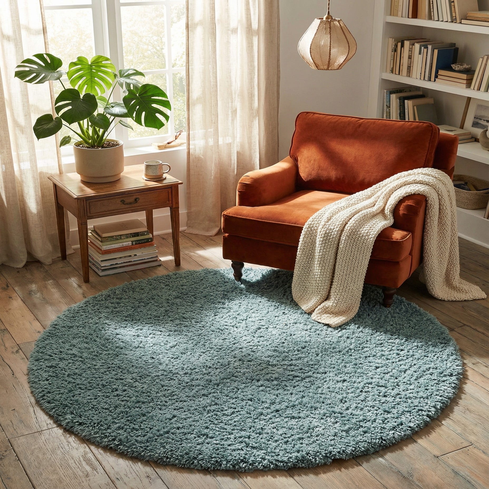 This rug works well wherever you want added softness and a calming color anchor: beneath a round coffee table to define a conversation area, under a small dining set to add comfort and color, or layered at the foot of a bed to soften a bedroom scheme. Slate blue pairs easily with warm woods, crisp whites, soft grays, and muted metallic accents, fitting contemporary, coastal, Scandinavian, or casual modern interiors while the round shape helps soften angular furniture layouts.