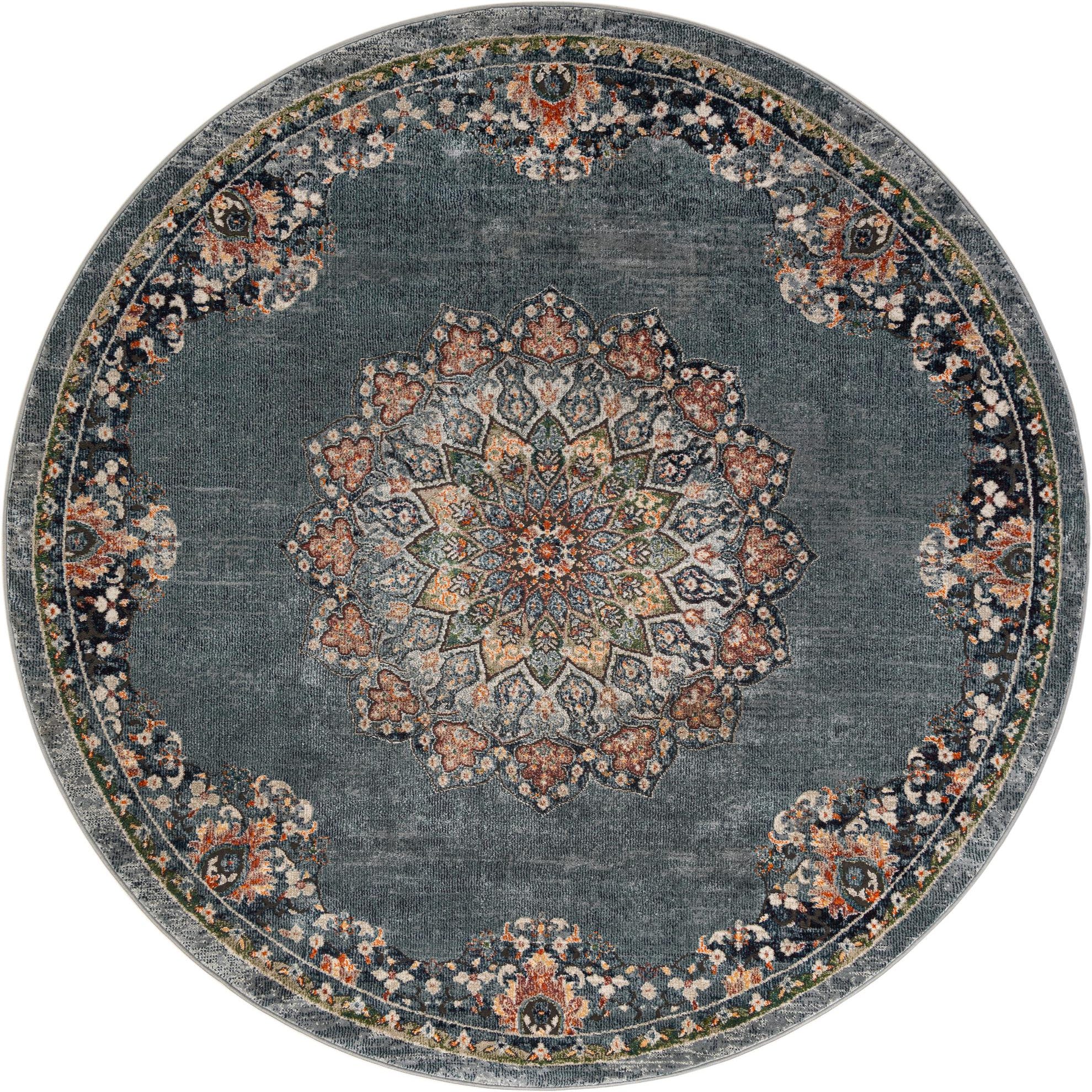 A round 8' blue traditional rug with an intricate orange and blue medallion pattern at its center, surrounded by a detailed floral border.