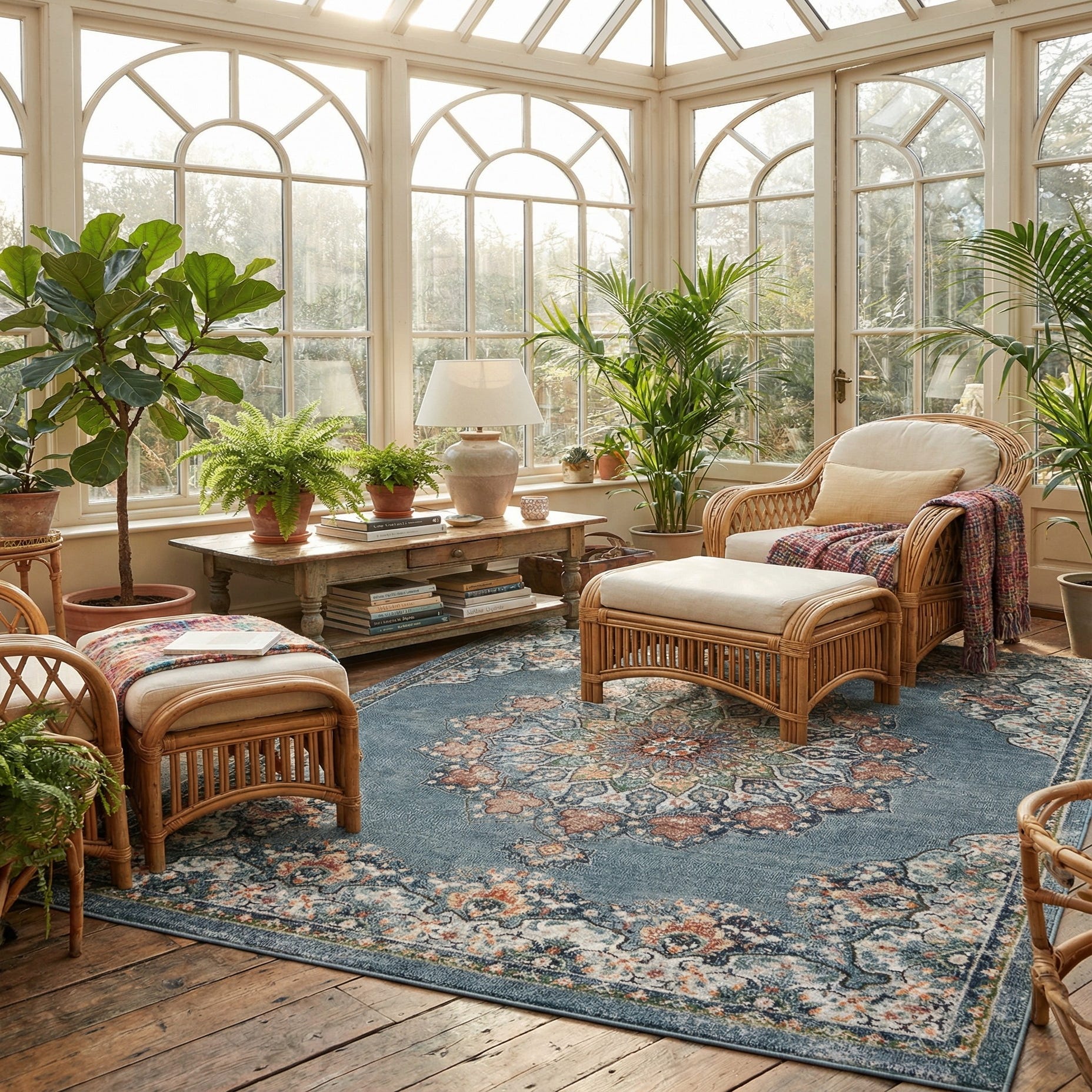 An 8x10 rectangular Isabella rug in shades of blue with a central medallion and traditional Oriental patterns in rust, cream, and green.