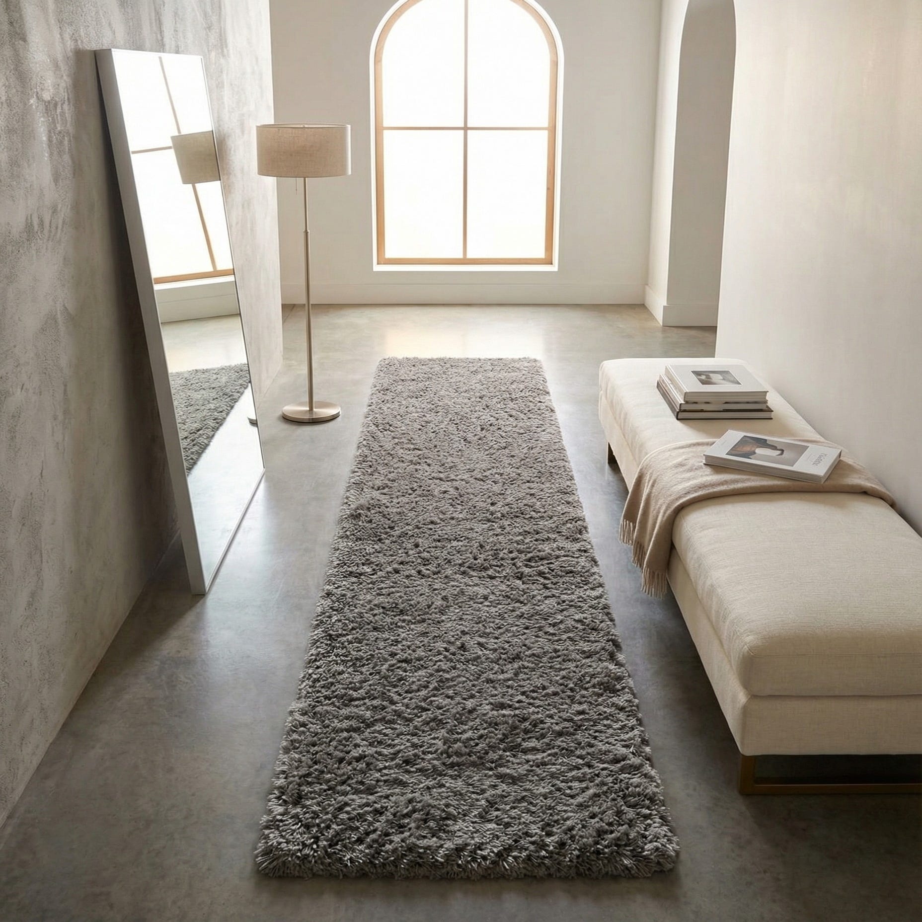 This runner works well in transitional and contemporary interiors where a neutral, grounding element is needed—think hallways, entryways, alongside beds, or layered in a modern living area. Pair it with warm wood tones to soften an industrial space, set against cool grays and metal accents for a streamlined look, or use it to add cozy texture to minimalist and Scandinavian schemes.