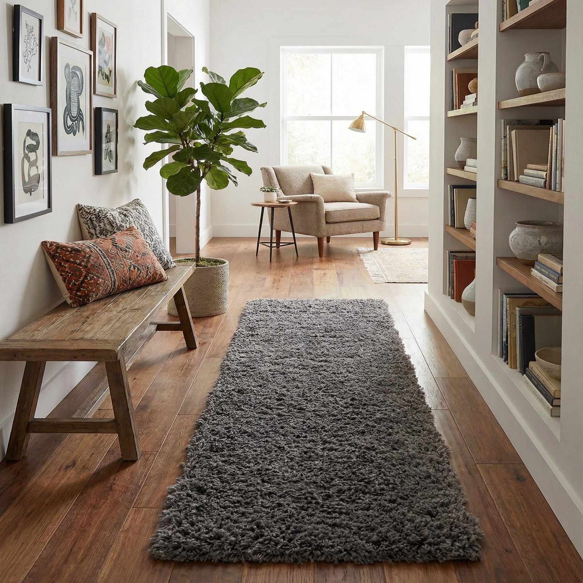 Place this runner in a hallway or entry to soften hard floors, lay it alongside a bed for a cushioned step in the morning, or use it to define a narrow kitchen or galley-style space. It pairs well with contemporary and transitional decor—think clean-lined furniture, mixed metal accents, or layered neutrals—and complements wood or concrete floors for a restrained, cozy look.