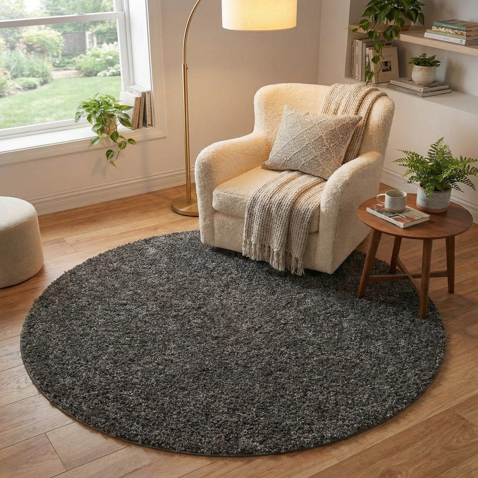 A solid smoke gray shag with a dense, even pile that invites bare feet, this round rug brings quiet texture to a space without drawing attention away from other design elements. The plush polypropylene yarn feels soft to the touch while the machine-made construction provides consistent loop height and edge definition. The monochromatic tone gives the surface subtle depth as the pile catches light, creating a cozy, tactile foundation for any room.