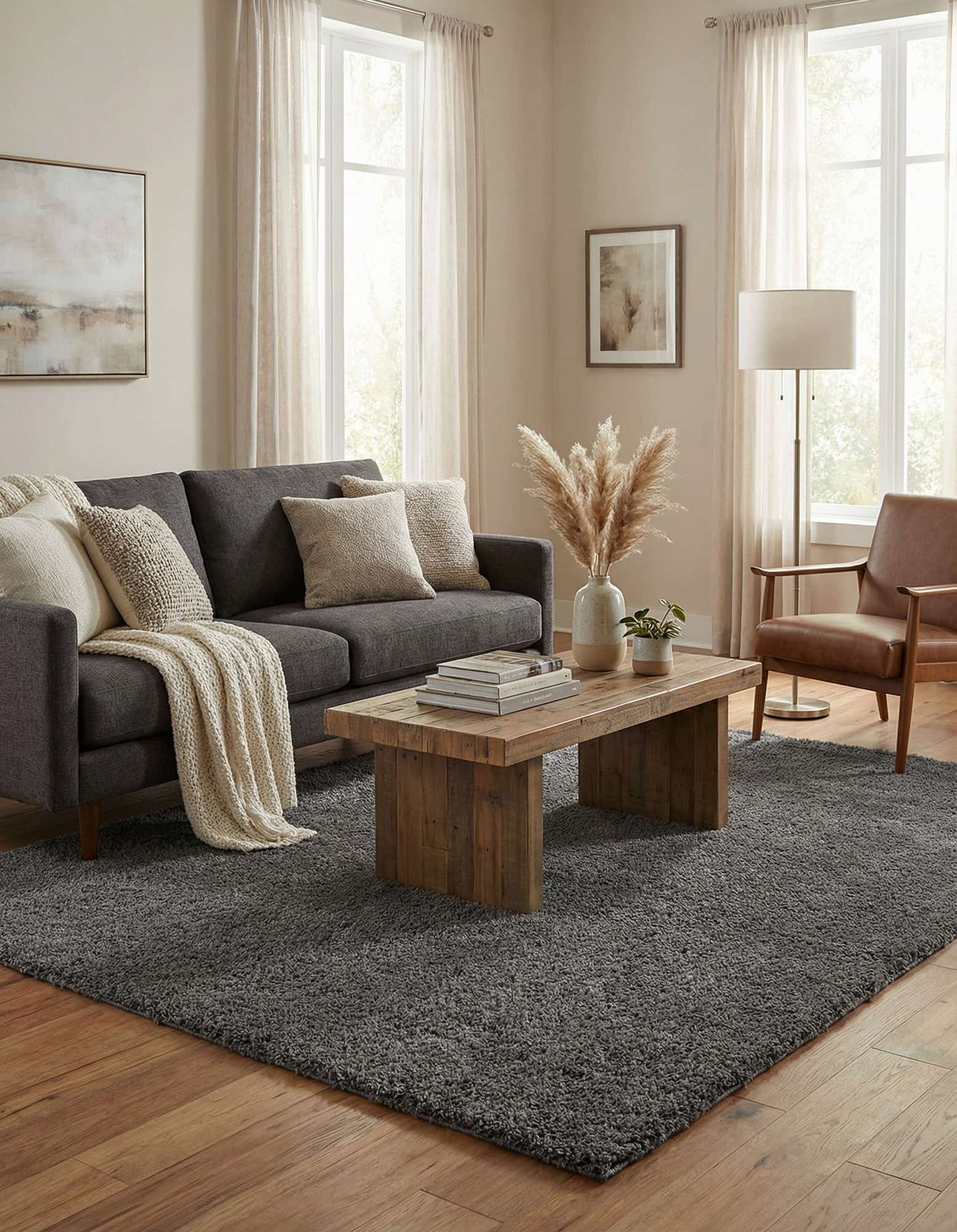 This piece works well as an anchor for a contemporary living room seating group, a cozy layer beneath a bed, or a soft landing in a home office or reading nook. Pair it with warm wood tones and neutral upholstery for a calm, layered look, or contrast it with lighter rugs or patterned throws to bring texture into a minimalist scheme. The solid smoke gray makes it a versatile choice for both monochromatic palettes and spaces that incorporate bolder accent colors.