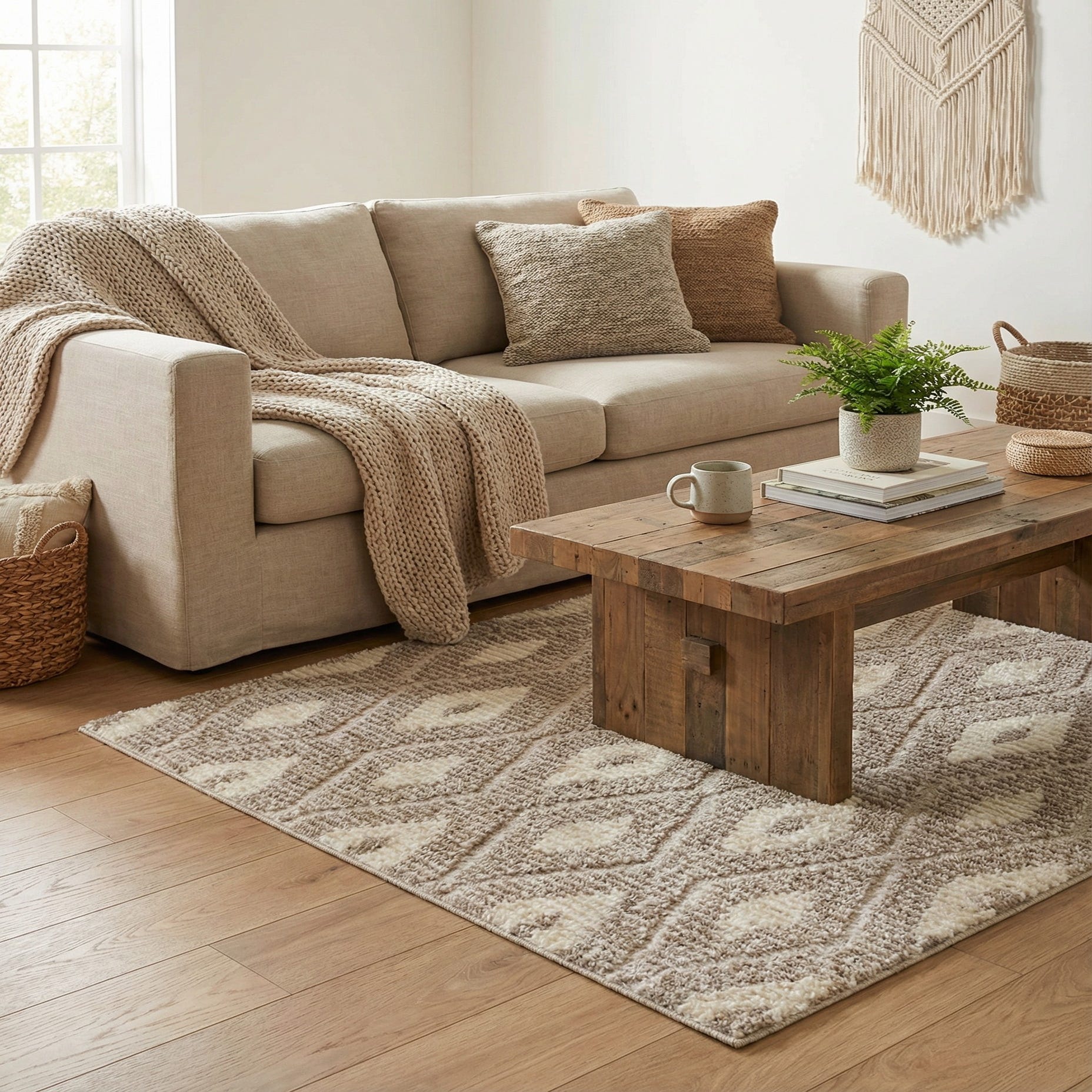 This neutral palette and balanced pattern work well in a variety of interiors — place it to anchor a living room seating area, layer it beneath a bed to add warmth to a bedroom, or set it in an entryway to introduce texture without overpowering the space. It pairs naturally with light woods and linen upholstery for a Scandinavian or coastal approach, and also complements leather and matte metal accents in modern farmhouse or transitional rooms.