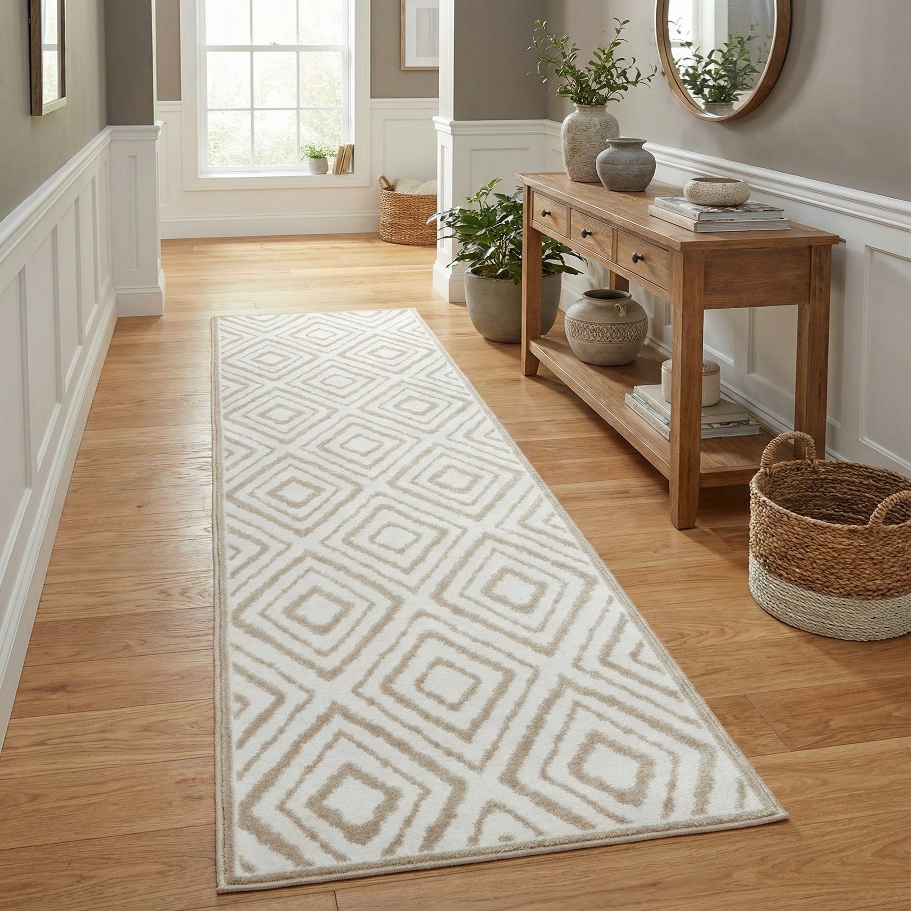 With its clean lines and quiet elegance, this rug offers a minimalist appeal that would complement a variety of interior design styles. The neutral color palette provides an excellent opportunity to harmonize with a range of color schemes, making it an ideal choice for contemporary urban spaces, minimal Scandinavian-inspired interiors, or transitional decors blending traditional and modern elements. Whether positioned in a hallway, defining a cozy nook, or accentuating the length of a galley kitchen, this runner rug will seamlessly integrate with the surrounding environment, enhancing the space with its understated charm.