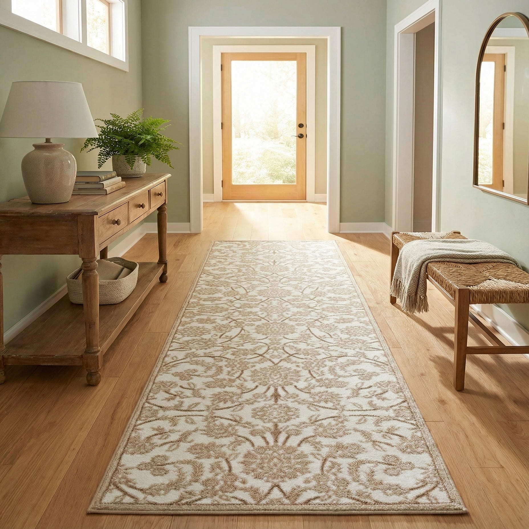 Place this runner in a bright hallway or entry to add subtle pattern without overpowering the space. It pairs naturally with light-wood floors, linen or neutral upholstery, and finishes found in modern farmhouse, coastal, or transitional interiors. The neutral palette also works well alongside muted colors or layered textures in a bedroom or narrow dining area where you want a refined, calming foundation.