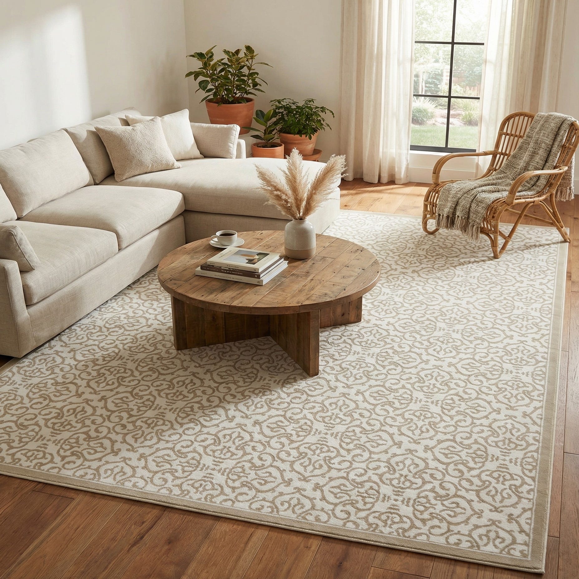 A crisp Snow White field provides a bright, clean backdrop for a repeating beige arabesque motif. The pattern is an all-over scrollwork lattice with delicate medallion shapes and a narrow beige border that frames the design. Machine-made from 55% polypropylene and 45% polyester, the rug has a low, dense pile that feels smooth underfoot and shows a subtle sheen from the polyester yarns, giving the surface a refined, low-profile texture that layers well beneath furniture.