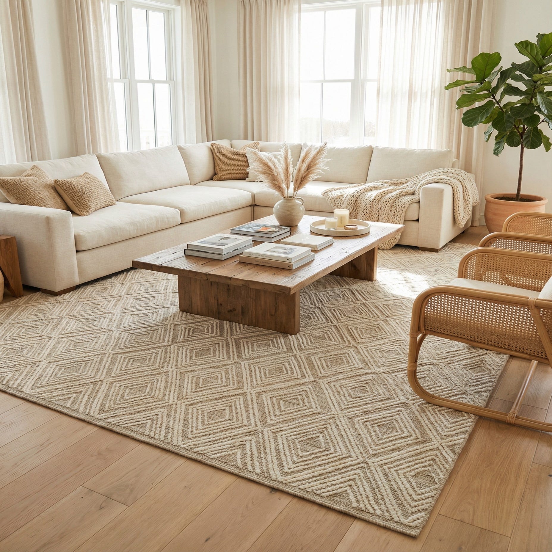 This rug's understated color scheme and dynamic pattern enable it to complement minimalist, contemporary, or Scandinavian interiors with ease. The neutral hues ensure compatibility with a wide range of color schemes, while the texture and pattern can add depth to a monochromatic room or serve as a grounding element in a more eclectic space. It is well-suited for placement in a spacious living room, under a dining table, or anchoring a bedroom setting, where its generous size can accommodate large furnishings and create a cohesive look.