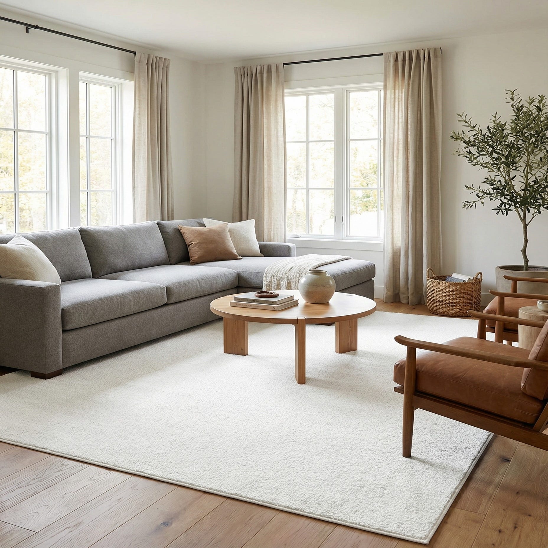 Machine made from 100% polypropylene, the dense frieze feels soft and slightly springy underfoot with a low, modern profile. It works best as a grounding layer in contemporary living rooms and crisp, airy bedrooms, and it pairs naturally with Scandinavian, coastal, or modern minimalist interiors. Use it to define a seating area beneath a sofa and coffee table, anchor a bed for a calm bedroom scheme, or lighten a home office while allowing furniture and textiles to take center stage.