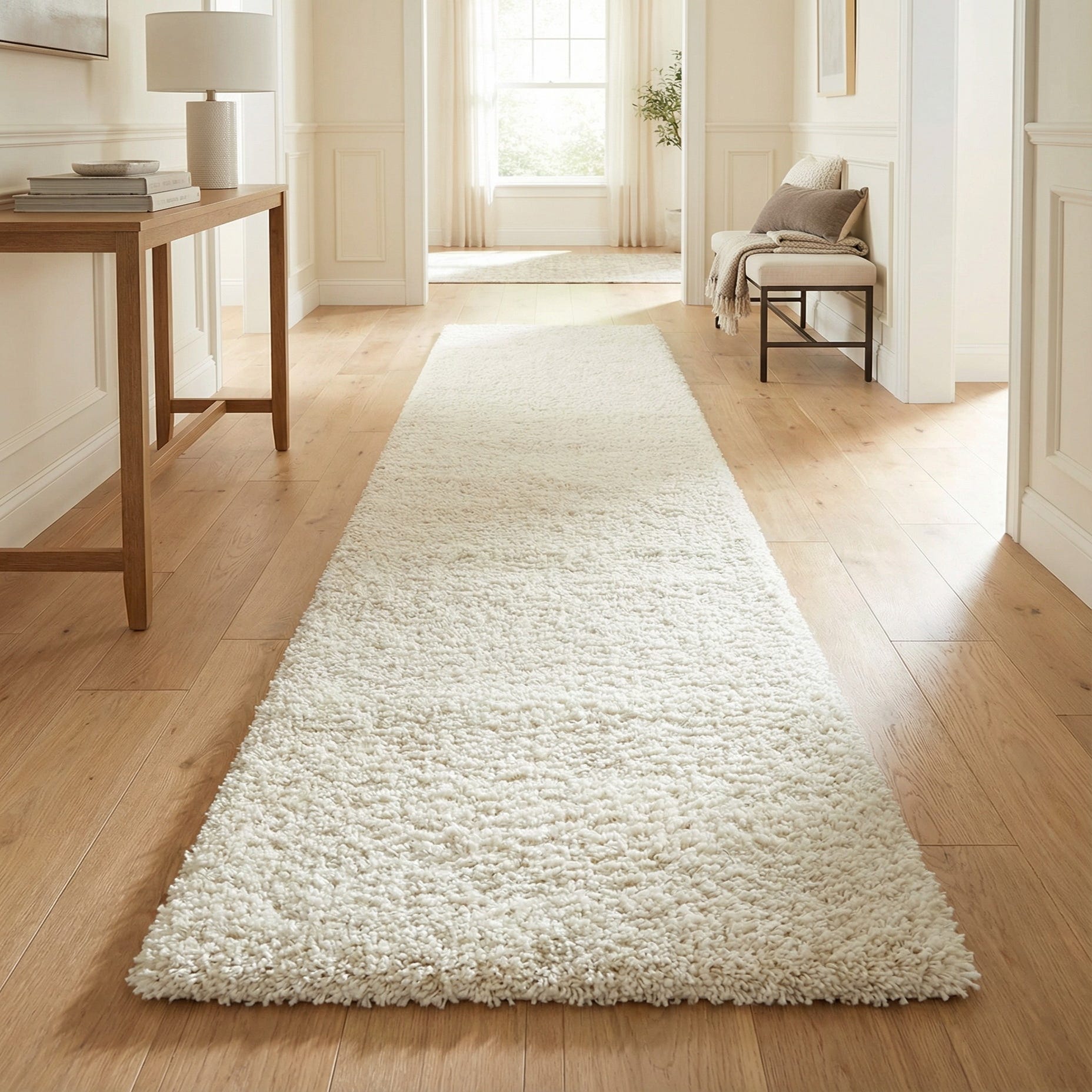 A plush, high-pile shag in crisp Snow White, this runner has a soft, cloud-like surface that invites bare feet. The pile creates a gentle, tactile texture with subtle shifts where the fibers catch the light, giving the rug a calm, understated presence. Pattern is minimal and modern—an all-over shag construction that reads clean and consistent along its length.