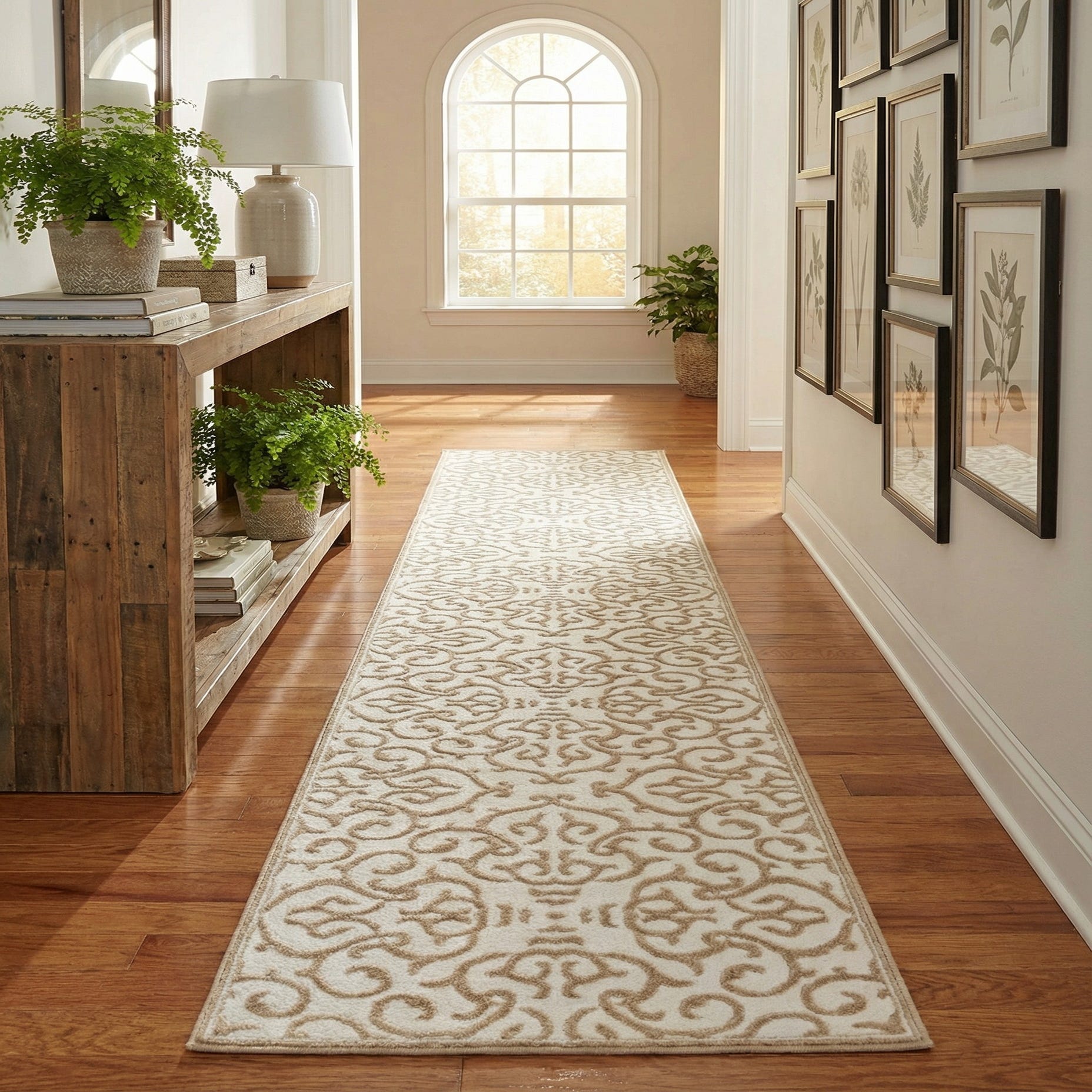 An airy scrollwork pattern in warm beige traces a repeating, symmetrical arabesque across a snow white field, creating a refined, timeless look. Machine-made from 55% polypropylene and 45% polyester, the runner has a soft, slightly plush hand and a subtle high-low texture that defines the raised pattern against the smooth background. The neutral two-tone palette keeps the look light and versatile while the intricate motif adds visual interest without overpowering a space.