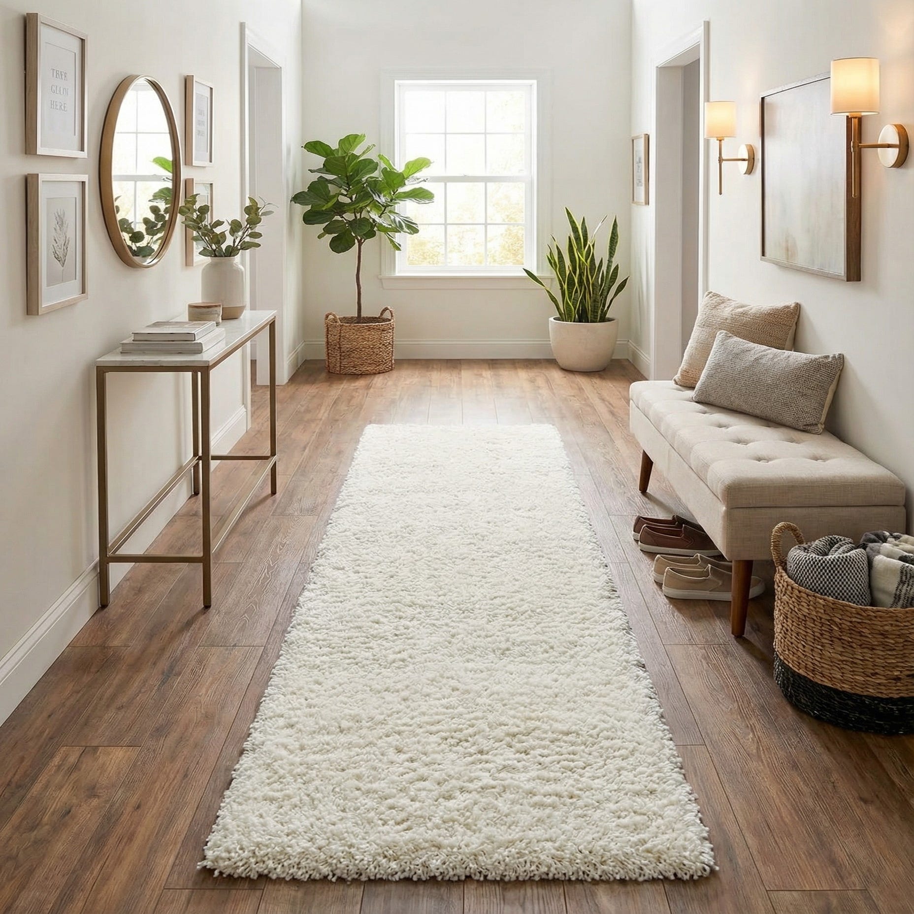 A long 13 ft runner rug in a solid white shag texture, perfect for brightening a hallway.