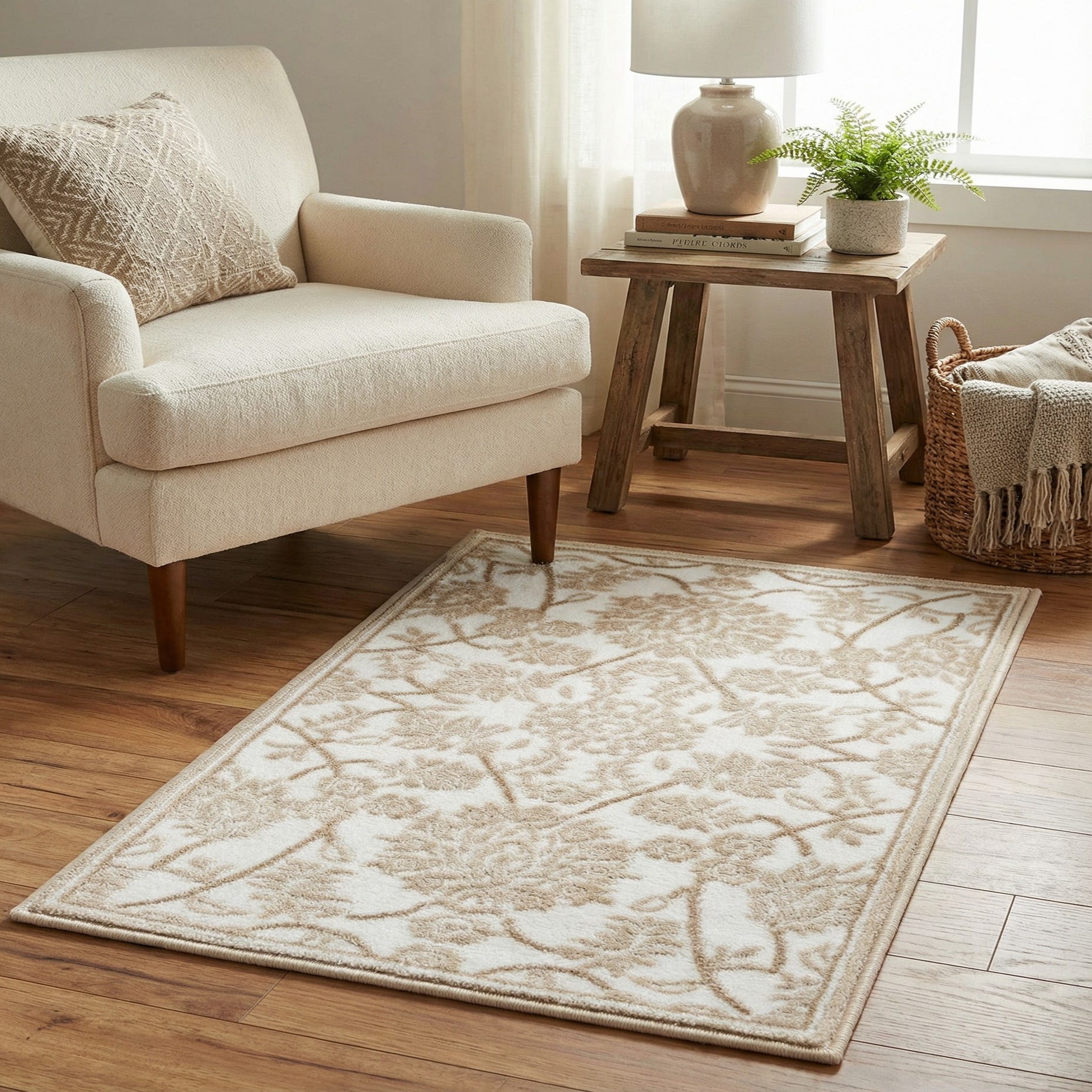 This neutral, refined look fits a variety of interior styles. Use it as an accent in an entry or hallway, place it in front of a bedside or vanity to warm a bedroom, or layer it near a small seating area to introduce pattern without overwhelming the space. It pairs particularly well with light wood furniture, soft gray or sandy upholstery, and décor leaning toward Scandinavian, modern farmhouse, coastal, or transitional palettes.