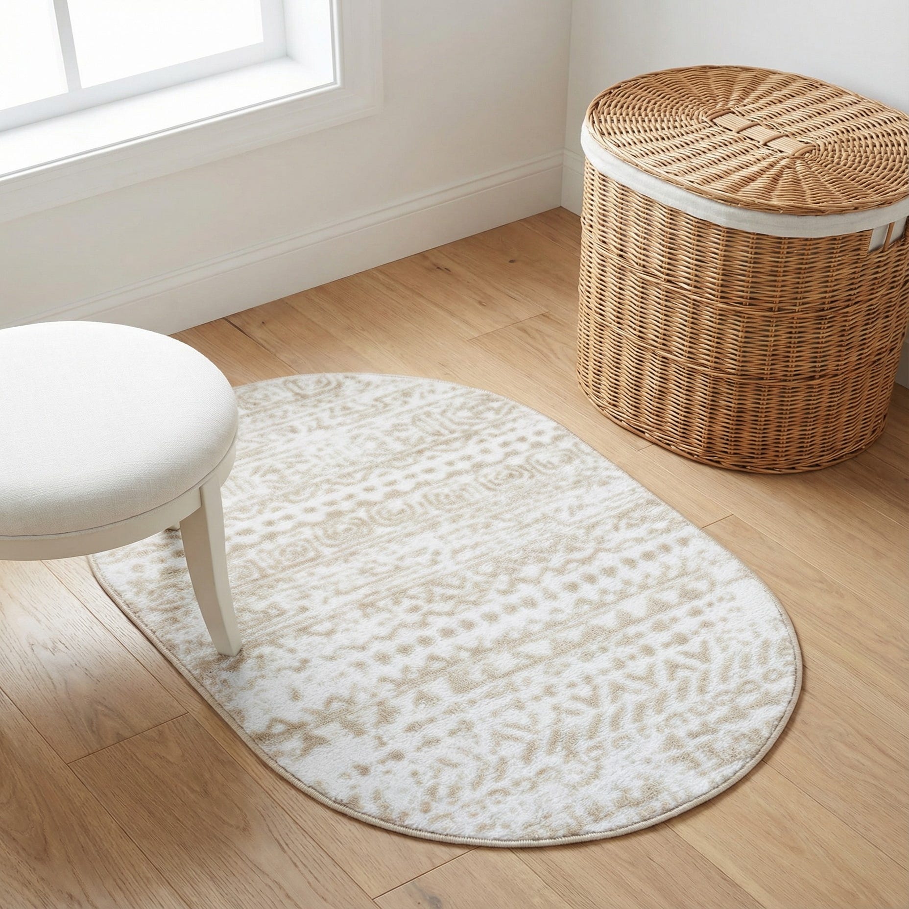 The Hermitage collection presents an elegantly understated rug in a 2x3 oval format, with a Snow White background complemented by soft Beige accents. The subtle pattern offers a graceful aesthetic that hints at tribal motifs, creating a gentle, rhythmic visual texture that could easily integrate into a variety of interior settings.