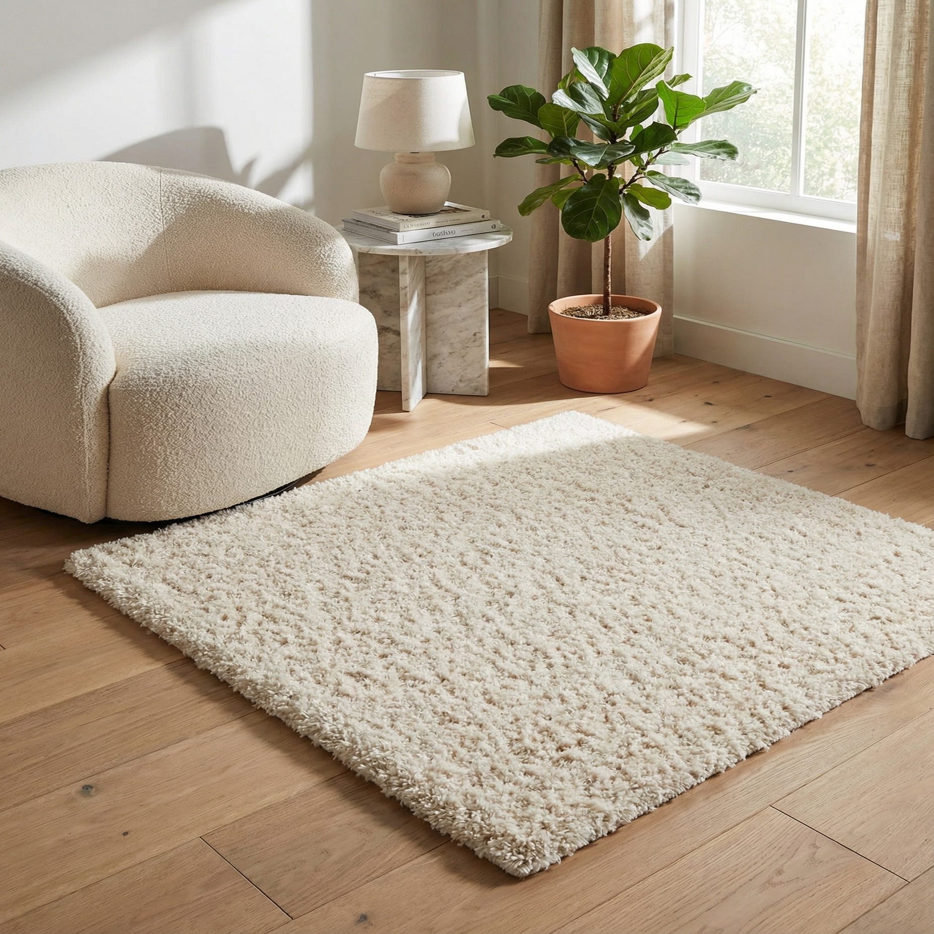 This Solid Shag rug offers a plush and dense pile that is perfect for bringing a cozy and warm element to any room. The snow white color of the rug makes it a versatile piece that could effortlessly complement a range of interior design styles, from modern minimalist to more eclectic and bohemian spaces. Machine woven from 100% polypropylene, it provides durability and longevity, making it suitable for high-traffic areas. The rug's stain-resistant and shed-free properties ensure easy maintenance while retaining its appealing texture and appearance.
