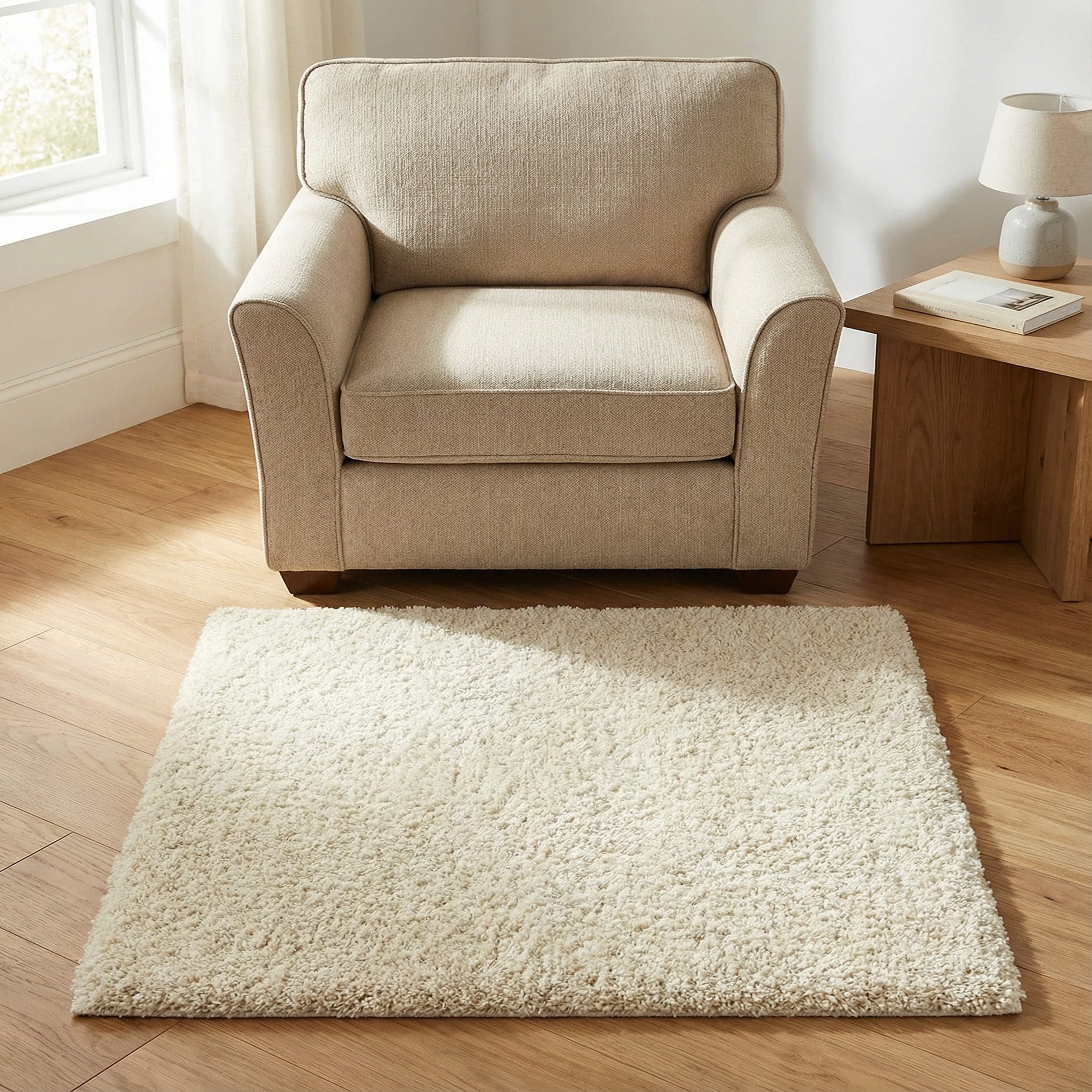 Measuring 3 ft square, this rug is well-suited for small spaces or as an accent piece in a larger room. Its luxurious texture can add depth to a living room, serve as a soft landing in a bedroom, or even define a reading nook. The uniform color and shaggy texture can create a focal point without overwhelming the existing decor due to its clean and understated design aesthetic.
