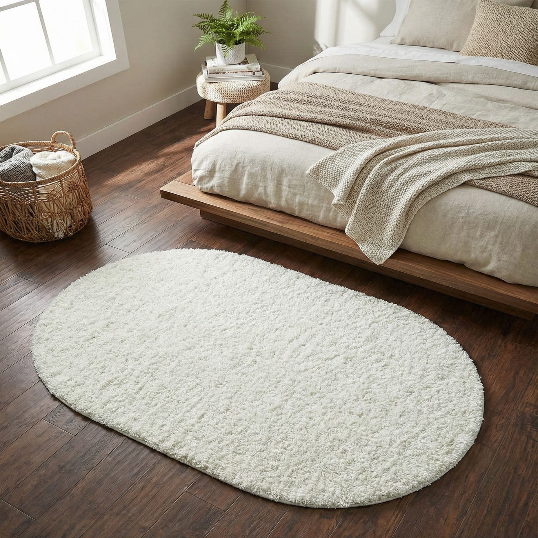 This white oval works well where a light, airy touch is desired: place it beside a bed to warm up a bedroom floor, nest it under a reading chair to define a small seating area, or layer it with a larger rug in a contemporary living room for contrast in shape and texture. It also pairs nicely with minimalist, Scandinavian, coastal, or modern farmhouse decor, helping soften sharper lines and brighten neutral palettes.