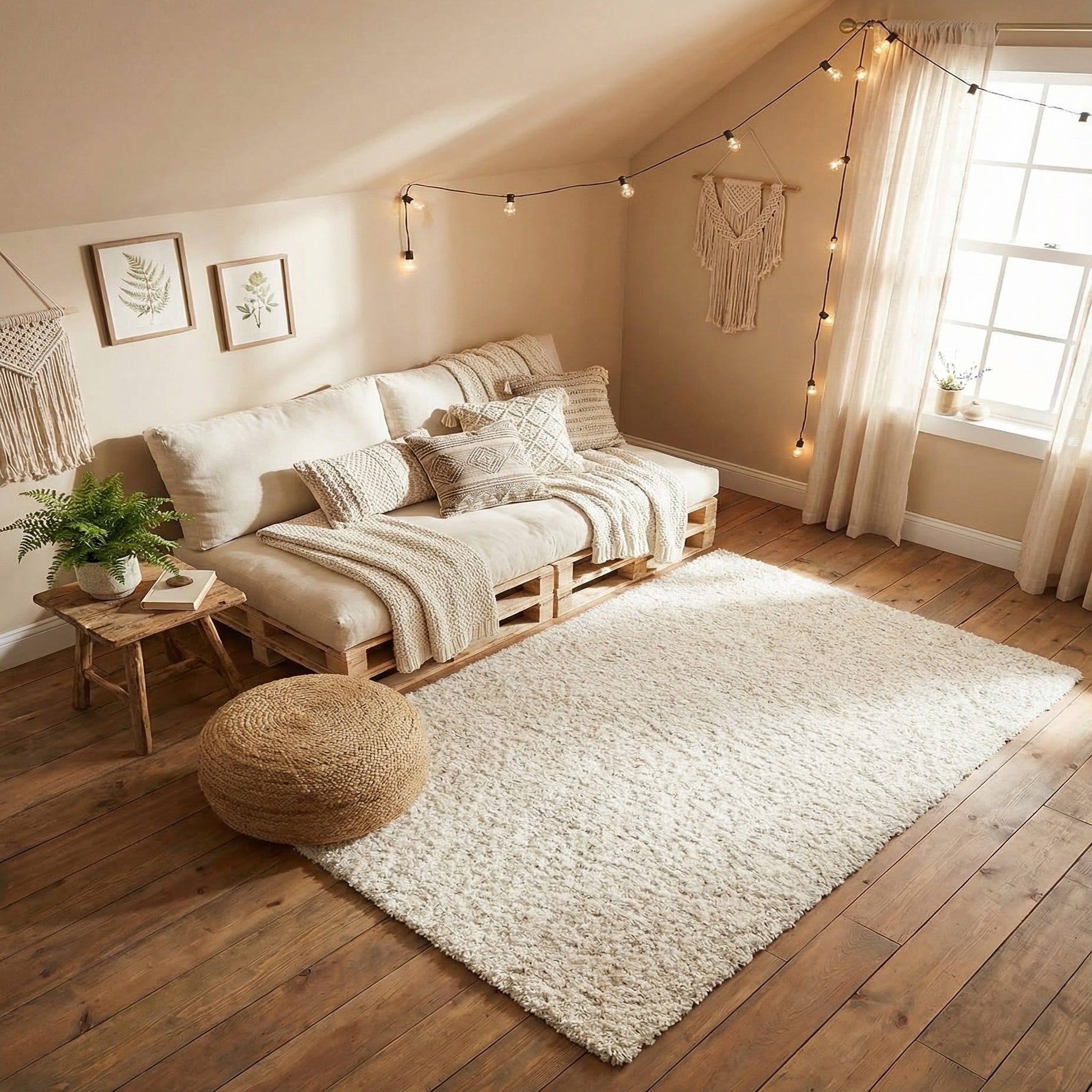 This rug fits well in minimalist, Scandinavian, or contemporary interiors where a neutral anchor is needed. Place it beneath a low-profile sofa and coffee table to brighten a living area, layer it in a bedroom to soften the space around the bed, or use it in a nursery or reading nook for added warmth and comfort. It pairs nicely with warm wood tones, matte metal accents, and textured textiles for a balanced, relaxed setting.