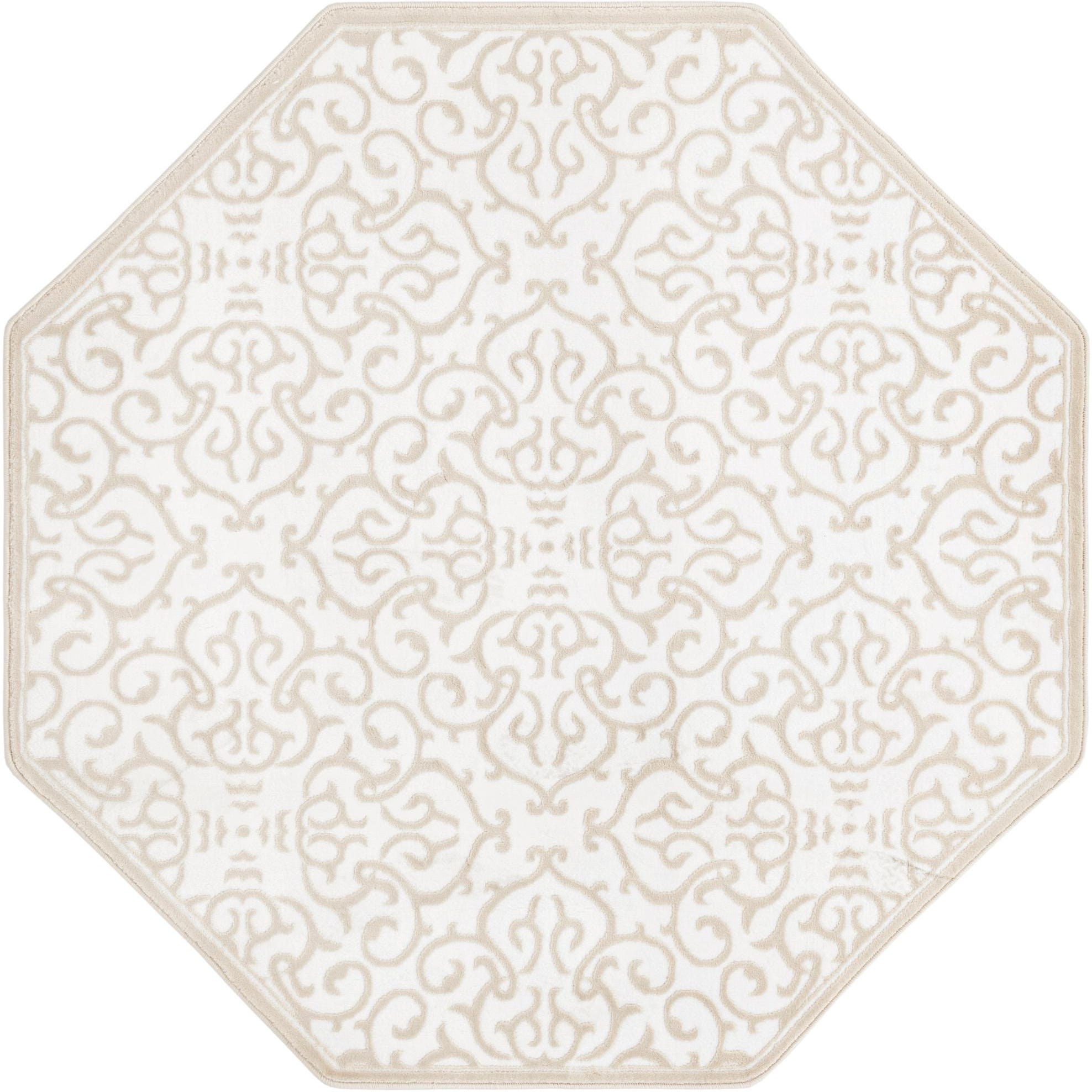 An octagonal area rug with a snow white field and an all-over scrolling medallion pattern in warm beige and light brown. The vine-and-scroll design is rendered with a slightly raised texture against a low-profile background, so you can feel the pattern underfoot as well as see it. Machine made from a 55% polypropylene and 45% polyester blend, the rug has a soft, plush hand with subtle dimensional interest where the motif rises from the pile.