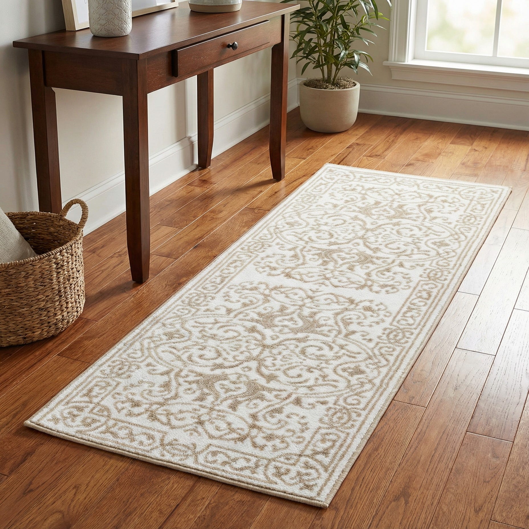 Primary color is Snow White. Colors in this rug include: Snow White, Beige.
