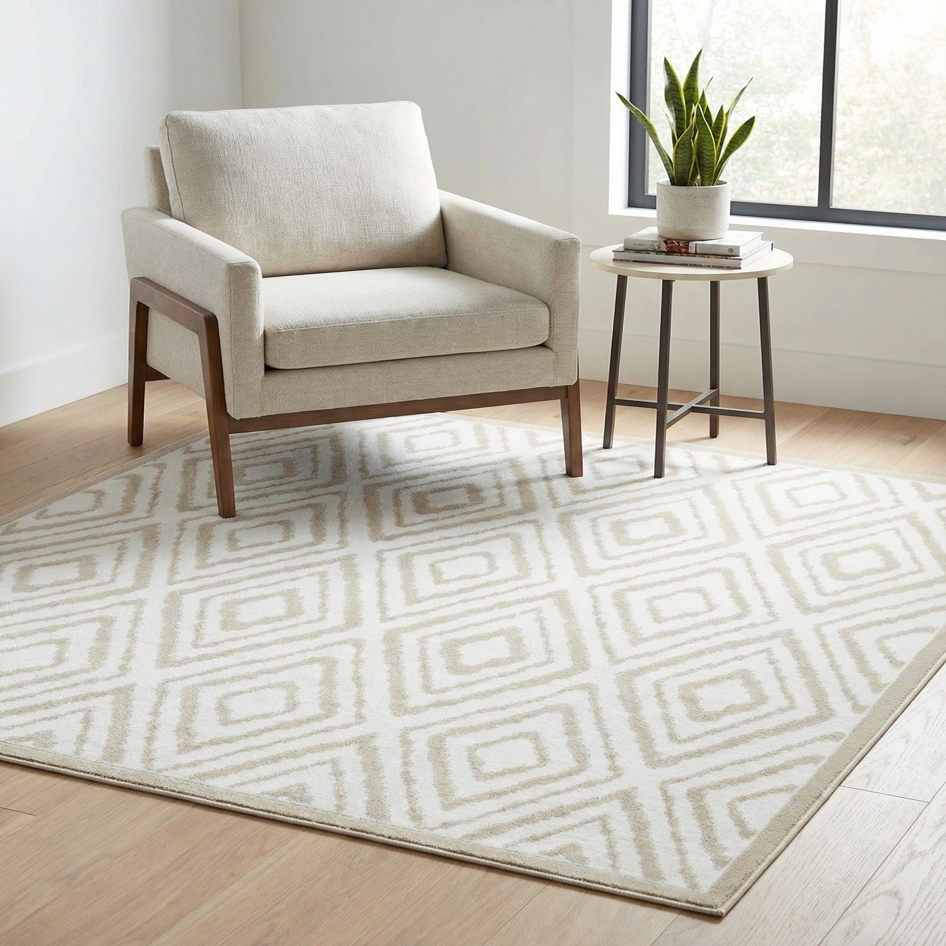 A 5' 3 x 5' 3 square white rug with a modern geometric pattern of interlocking beige diamonds, suitable for a living room or patio.