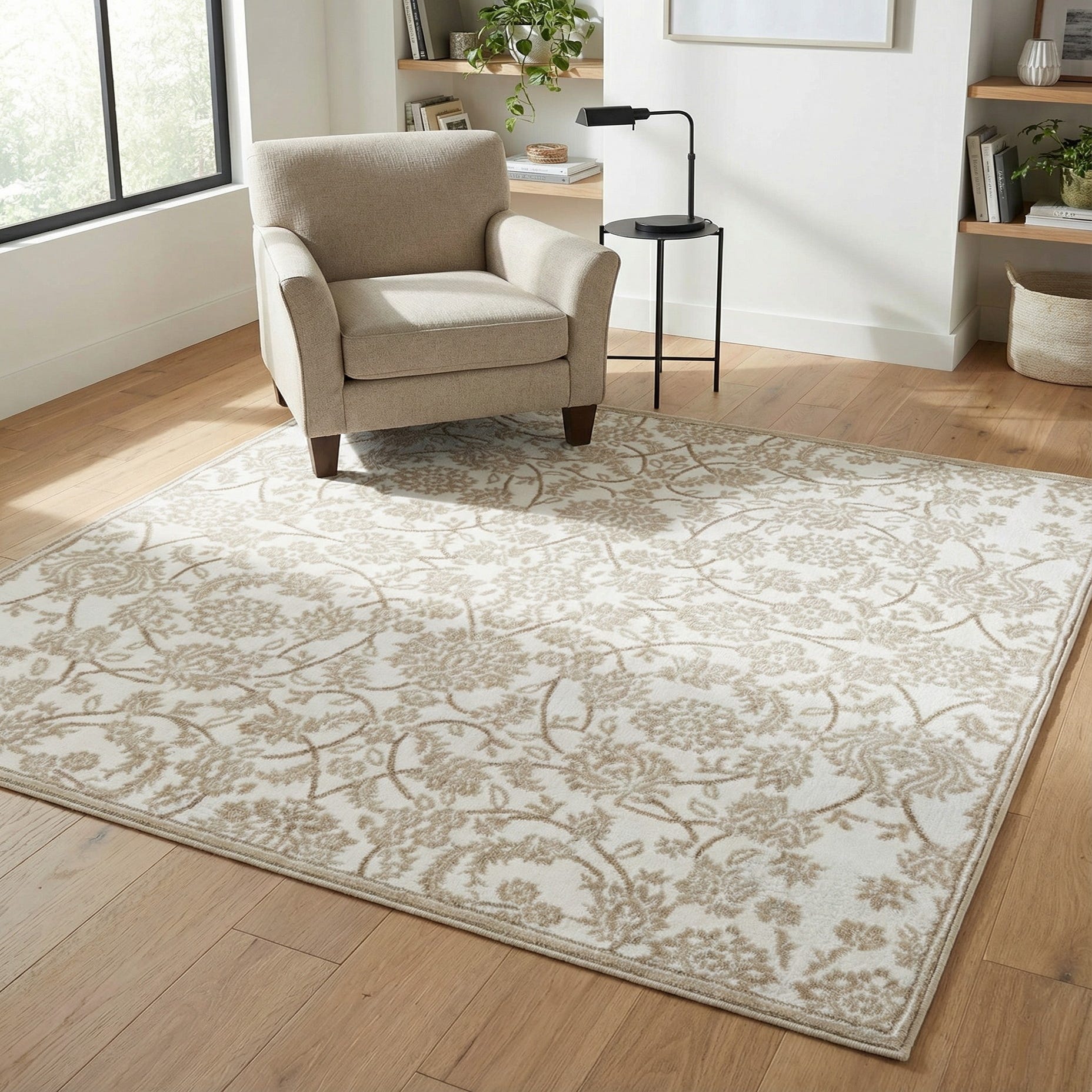 This neutral palette and classic motif work well in bright, airy living rooms, a serene bedroom, or a welcoming entry where it can anchor seating or a console. Pair it with natural wood furniture, linen upholstery and soft metallic accents for a transitional or modern farmhouse look, or keep the scheme minimal with pale walls and streamlined furnishings for Scandinavian-inspired interiors. The rug provides a quiet, elegant foundation that complements both layered textures and simple, pared-back decor.