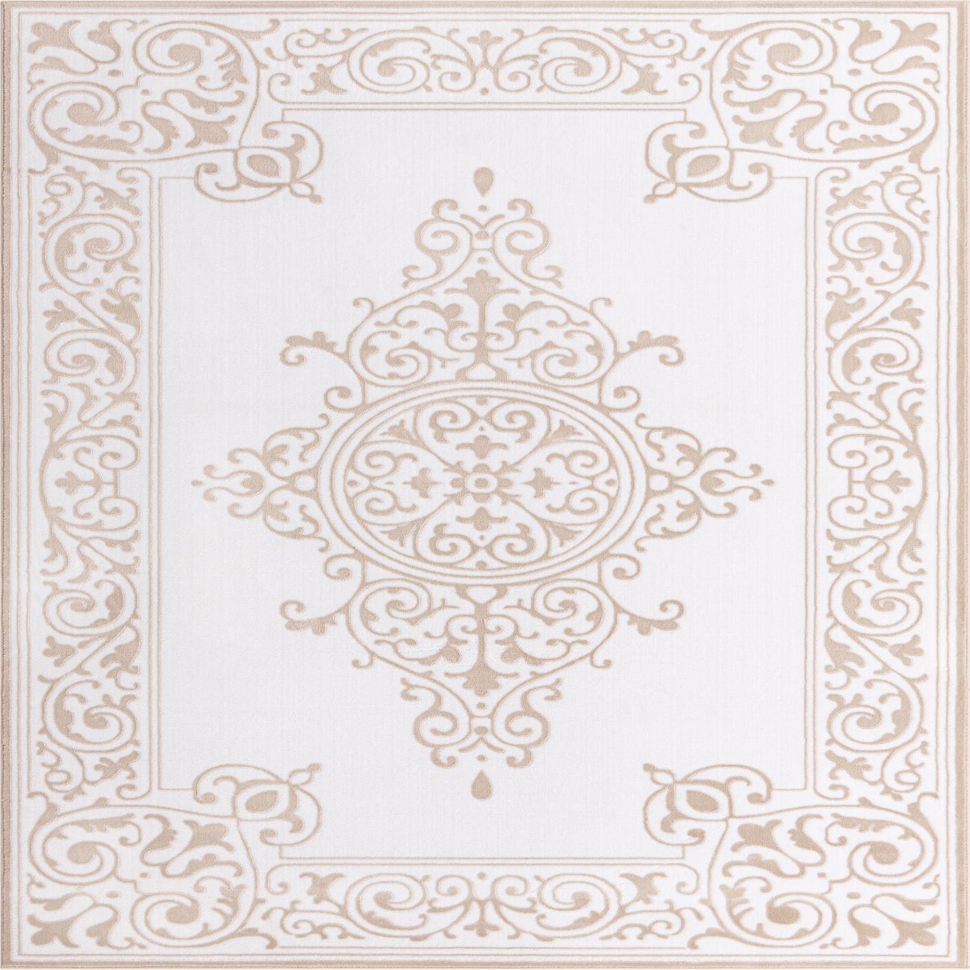 A 5x8 rectangular white rug with a traditional medallion pattern and ornate beige scrollwork border.