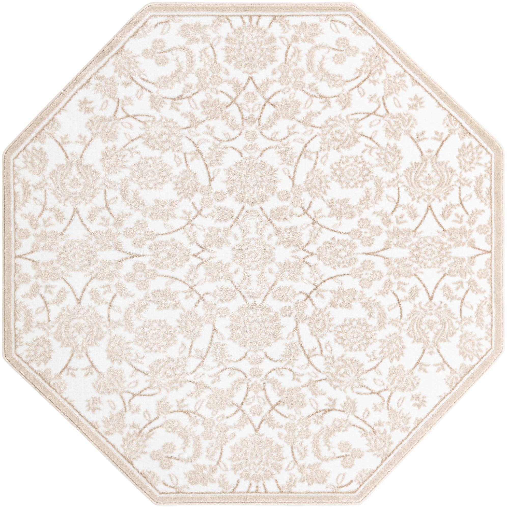 This octagonal rug pairs a Snow White ground with a refined floral medallion and scrolling vine motif in soft beige and light brown. The pattern reads clear and detailed against the bright background, while the pile has a low, velvety hand—polyester adds a gentle sheen and smooth touch, and polypropylene provides a resilient, even surface. Machine-made construction with 55% polypropylene and 45% polyester delivers a consistent texture and well-defined pattern across the face of the rug.