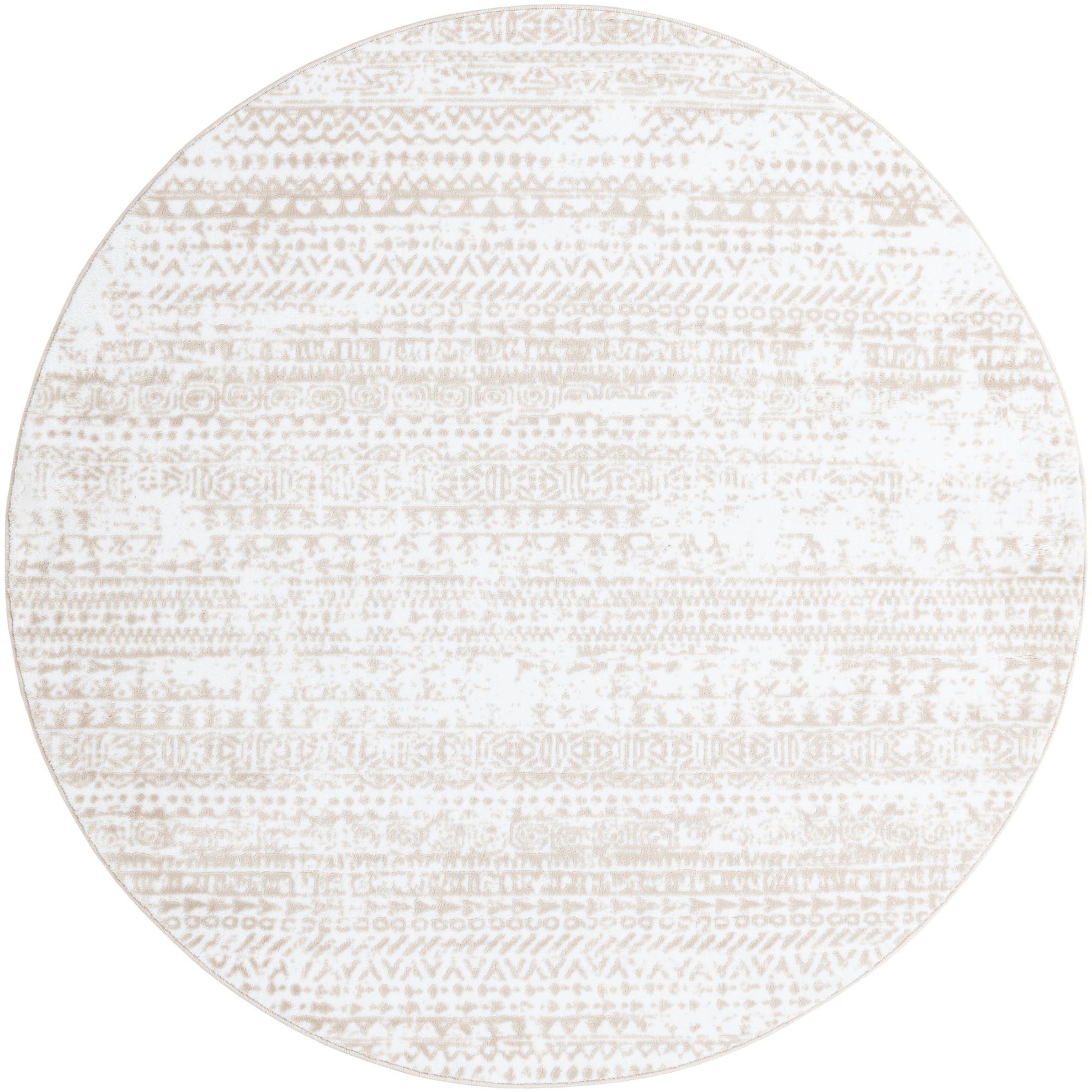 A round 6' 0 x 6' 0 white tribal rug with subtle beige modern stripe patterns, featuring a textured high/low pile.