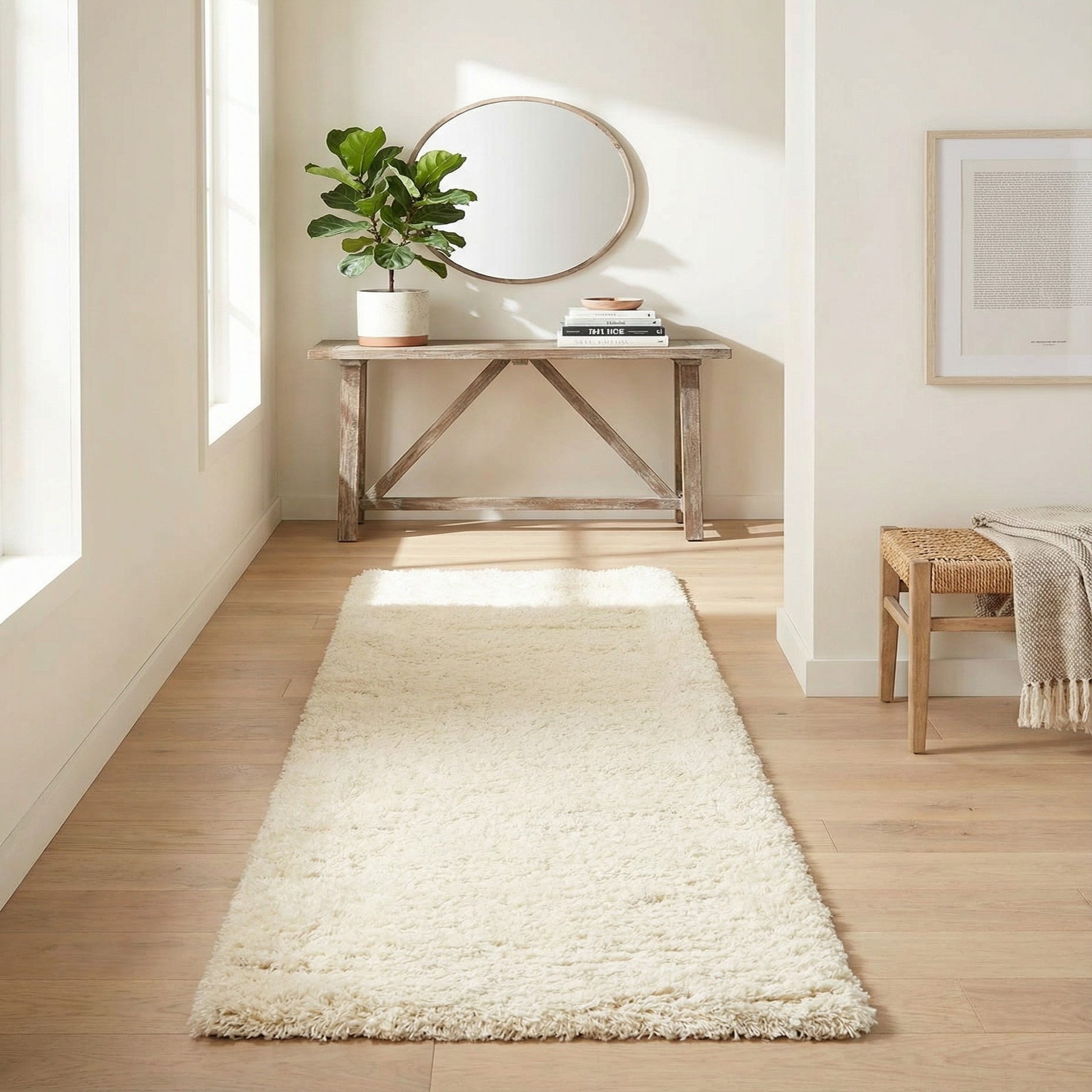 A 6 ft runner rug from the Solid Shag collection, featuring a plush, textured white pile, perfect for a hallway.