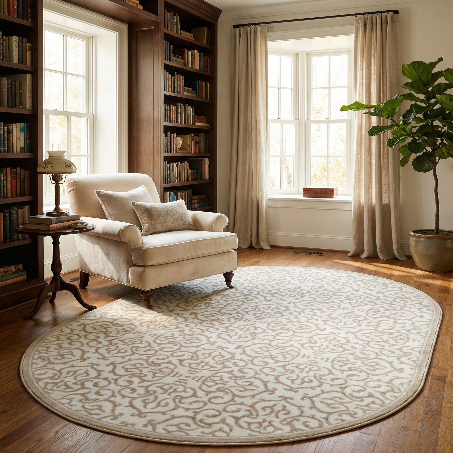 The snow white base of the rug serves as a versatile canvas for the beige motif, catering to a variety of interior styles. The stain-resistant and shed-free qualities ensure the rug remains a steadfast addition to high-traffic areas. Its oval shape grants it a unique presence in any room, making it an ideal choice for anchoring furnishings in a living room or for adding a soft touch to a bedroom.
