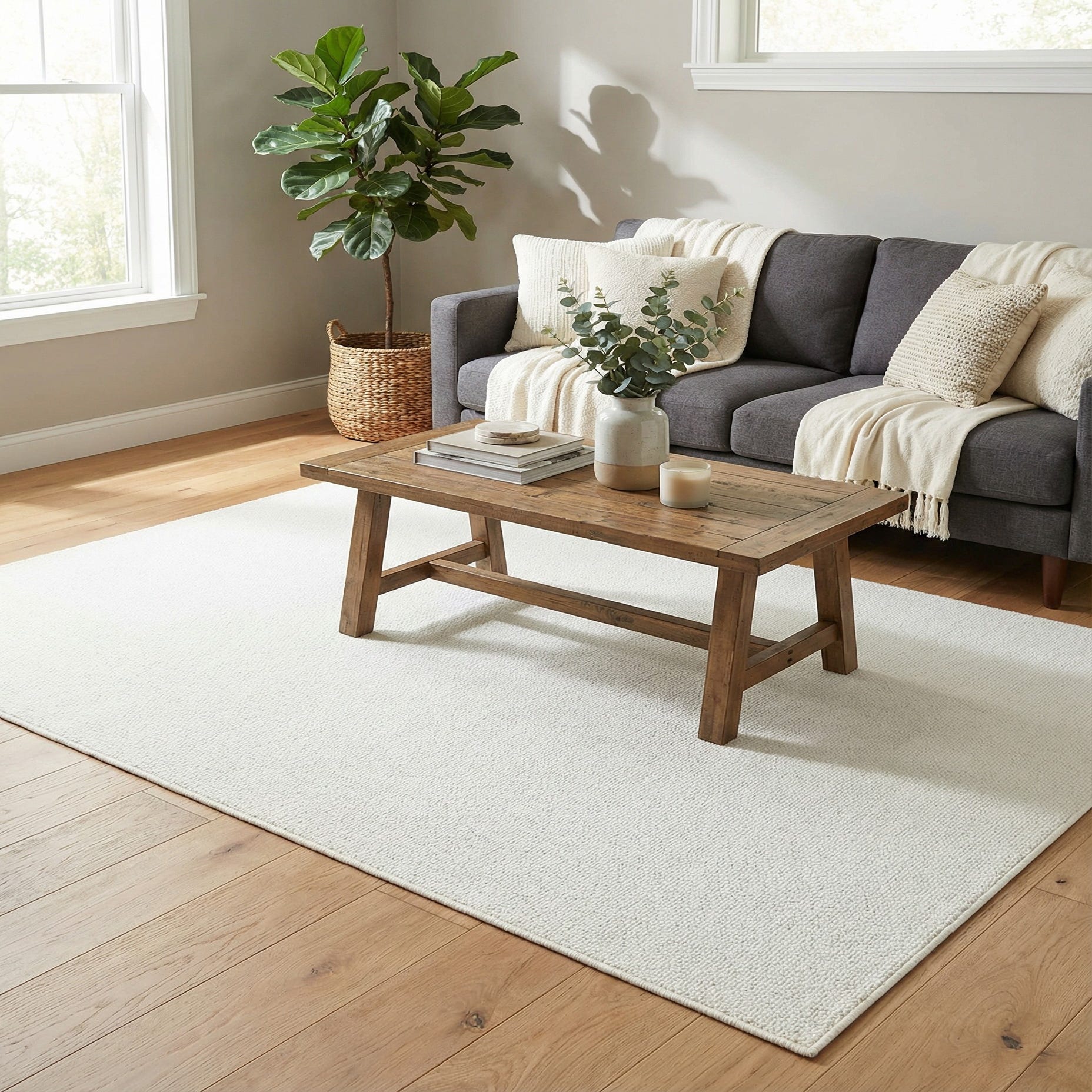 With its simple and clean design, this rug can seamlessly integrate into minimalist, modern, or Scandinavian-inspired interiors. Its solid color scheme and frieze texture can also serve as a subtle complement within a more eclectic or bold aesthetic, without overpowering other design elements in the space. The rug’s dimensions make it an ideal choice for defining a cozy seating area or anchoring a small to medium-sized living space.