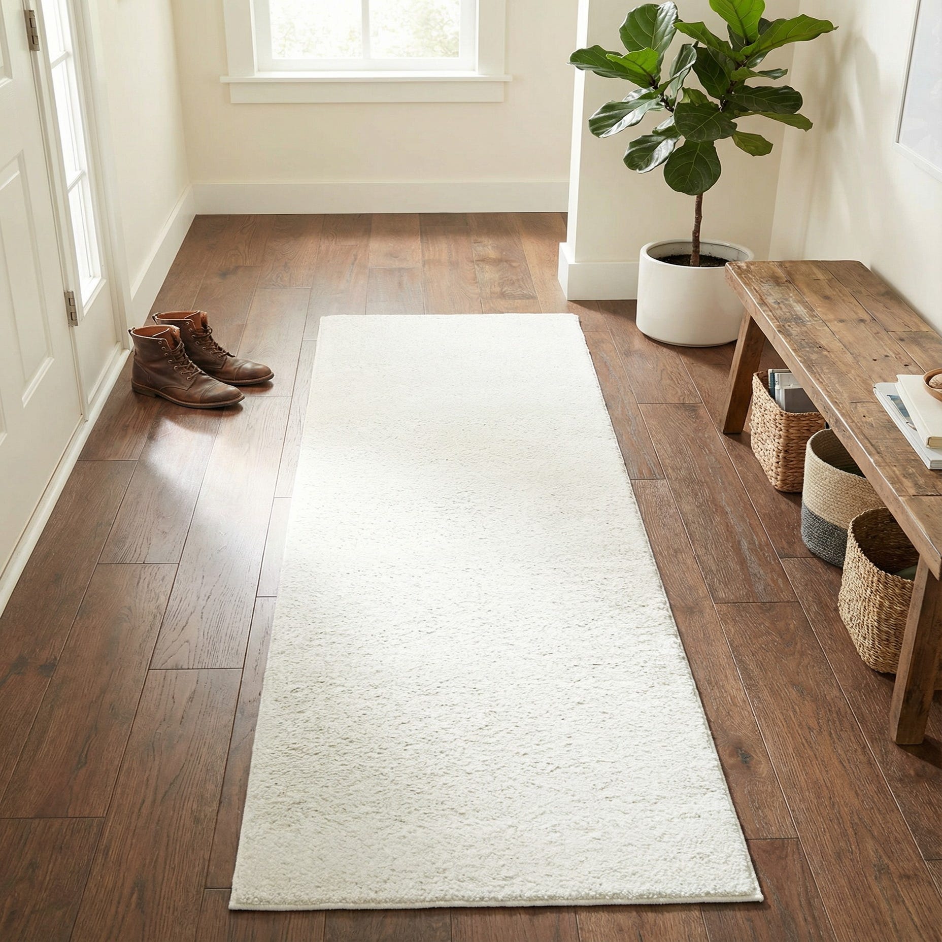 Place this runner in narrow circulation areas like hallways and entryways, or layer it in front of a sofa or along the side of a bed to add a soft, neutral base. Its clean white tone and understated texture pair well with Scandinavian and modern-minimal interiors, coastal schemes with light woods and linens, or transitional spaces that use bold accents against a calm foundation.