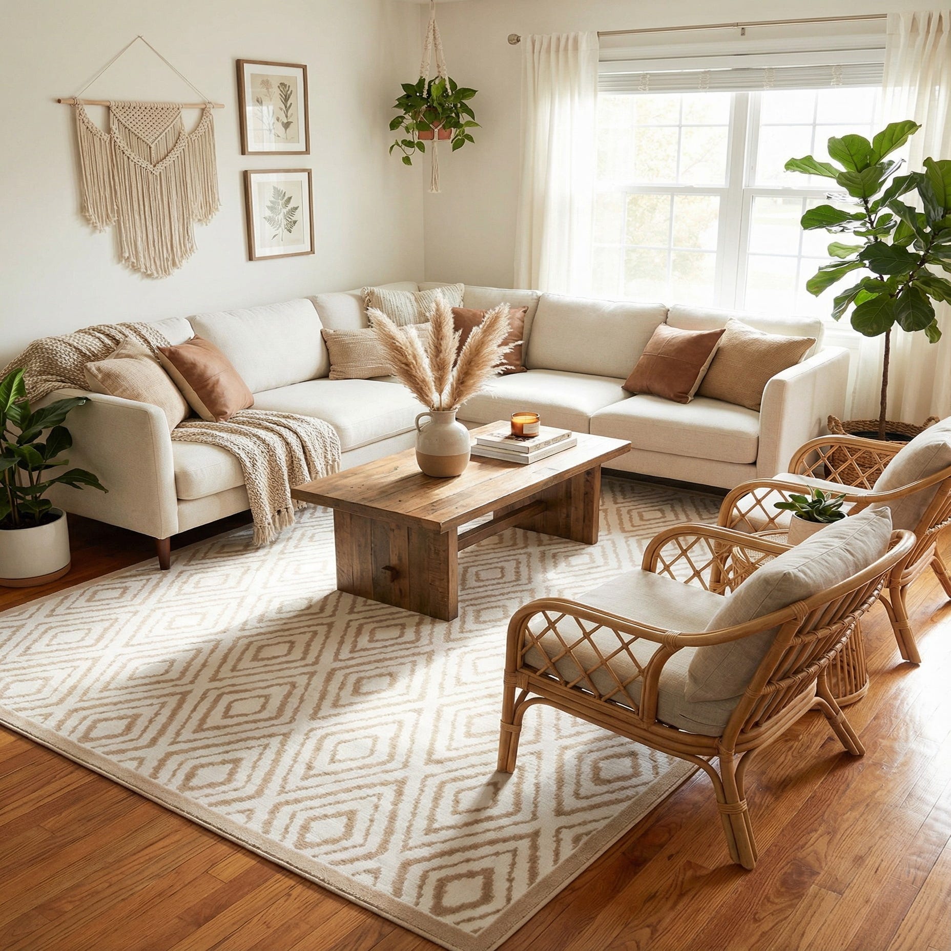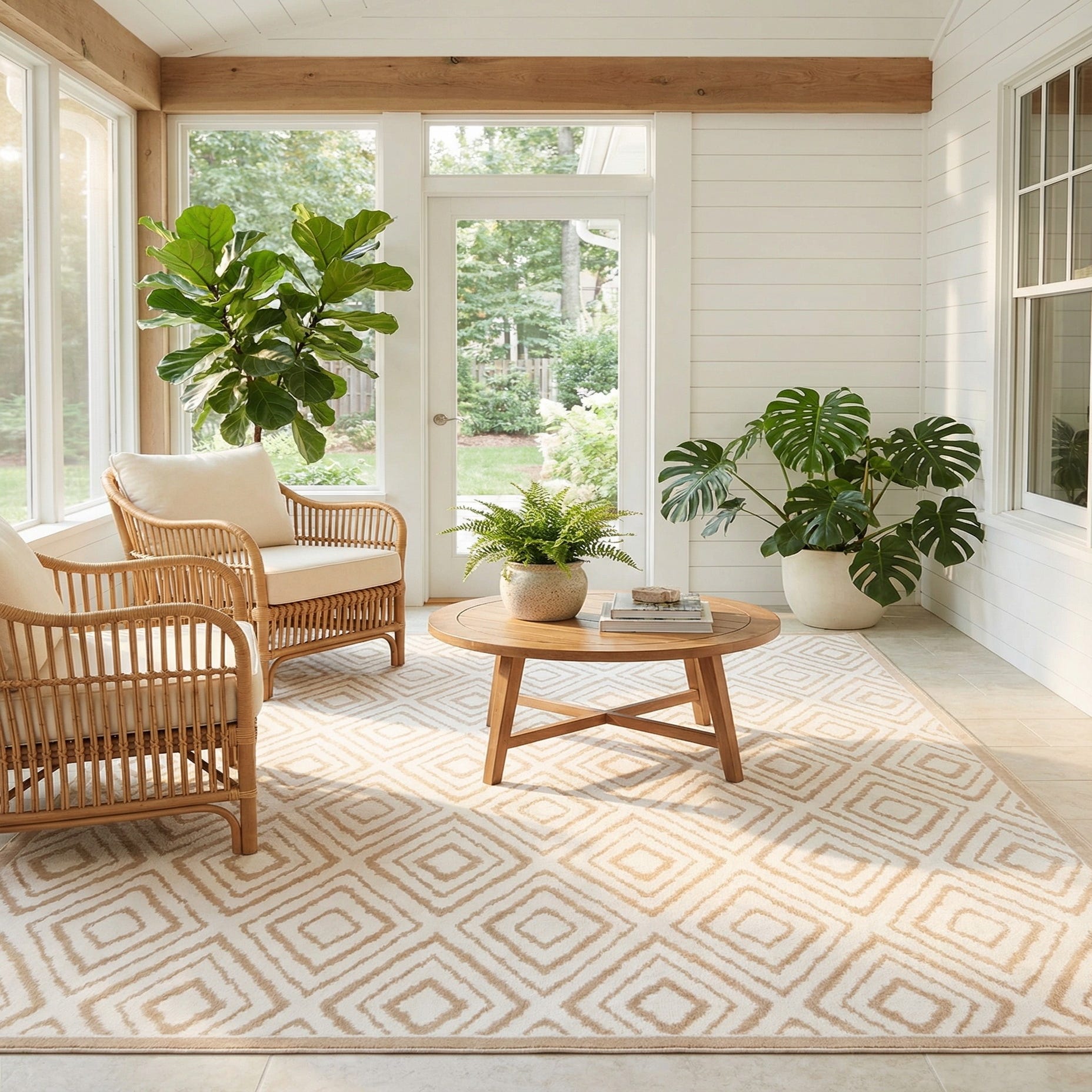 A 7x10 rectangular Rugs.com Hermitage rug featuring a modern abstract diamond pattern in white and beige tones.