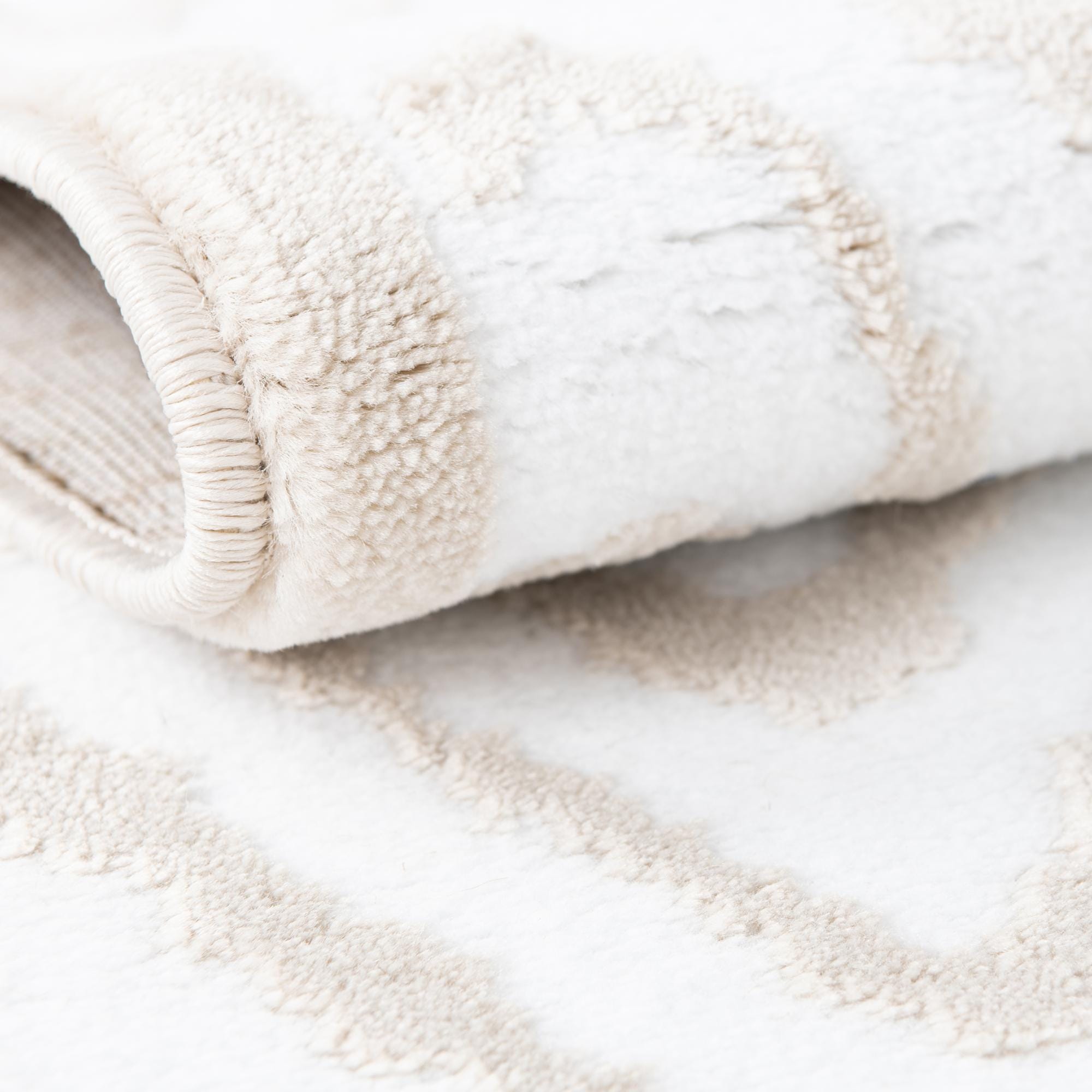 Primary color is Snow White. Colors in this rug include: Snow White, Beige.