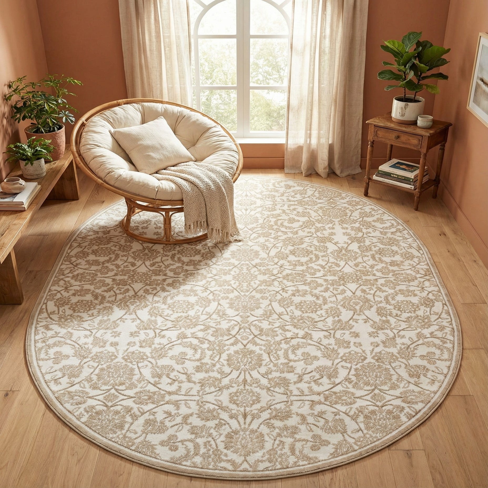 Thanks to its neutral color scheme and gentle patterning, this rug integrates seamlessly with a variety of interior design styles, from contemporary to classic. It would serve as a subtle yet sophisticated foundation in a living room under a coffee table or a dining area, enhancing the space without overpowering the other design elements. The soft tones complement wooden or lightly colored floors, and its oval shape offers a unique alternative to the typical rectangular rugs, ideal for creating a focal point in spacious rooms or softening the geometry of an interior space.