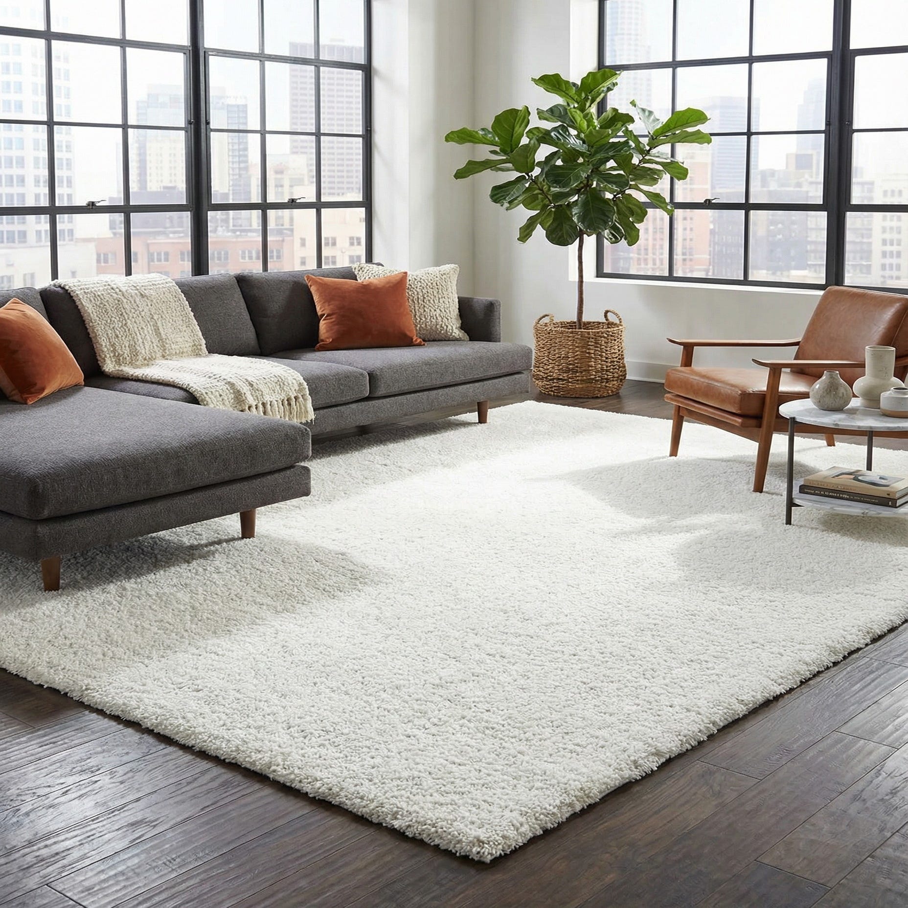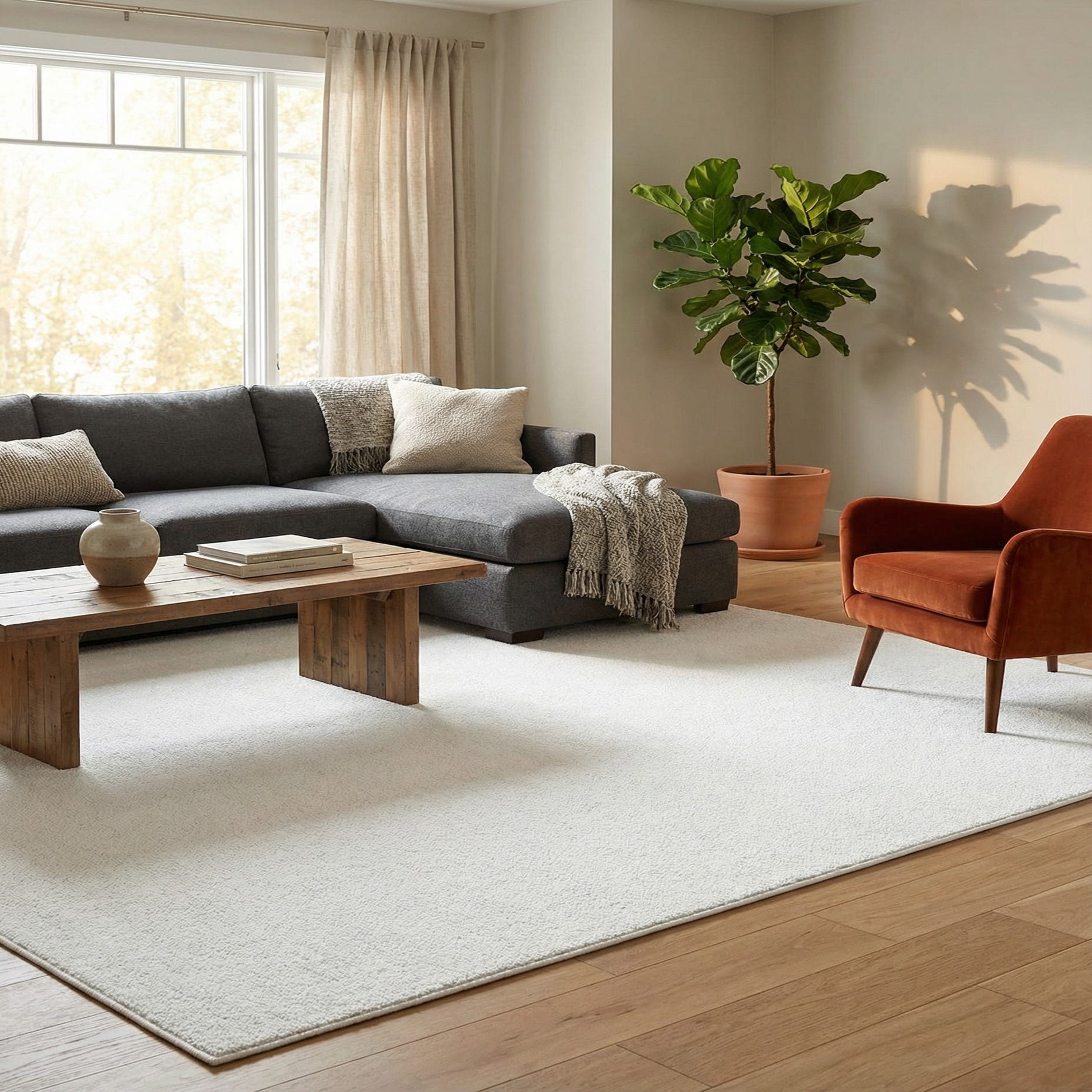 This rug works well as a neutral foundation in modern, Scandinavian, or coastal interiors, where it brightens the room without competing with other elements. Place it under a low-profile sofa and coffee table to anchor a living area, layer it beneath a bed to create a soft step-out-of-bed surface, or use it in a light-filled home office to maintain a calm, airy feel. Pair with warm wood tones, soft gray upholstery, or matte black metal accents for a balanced, contemporary look.