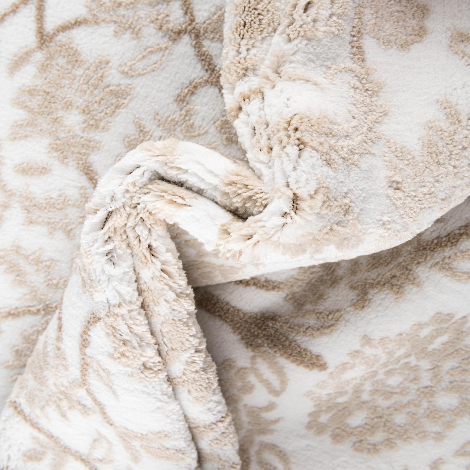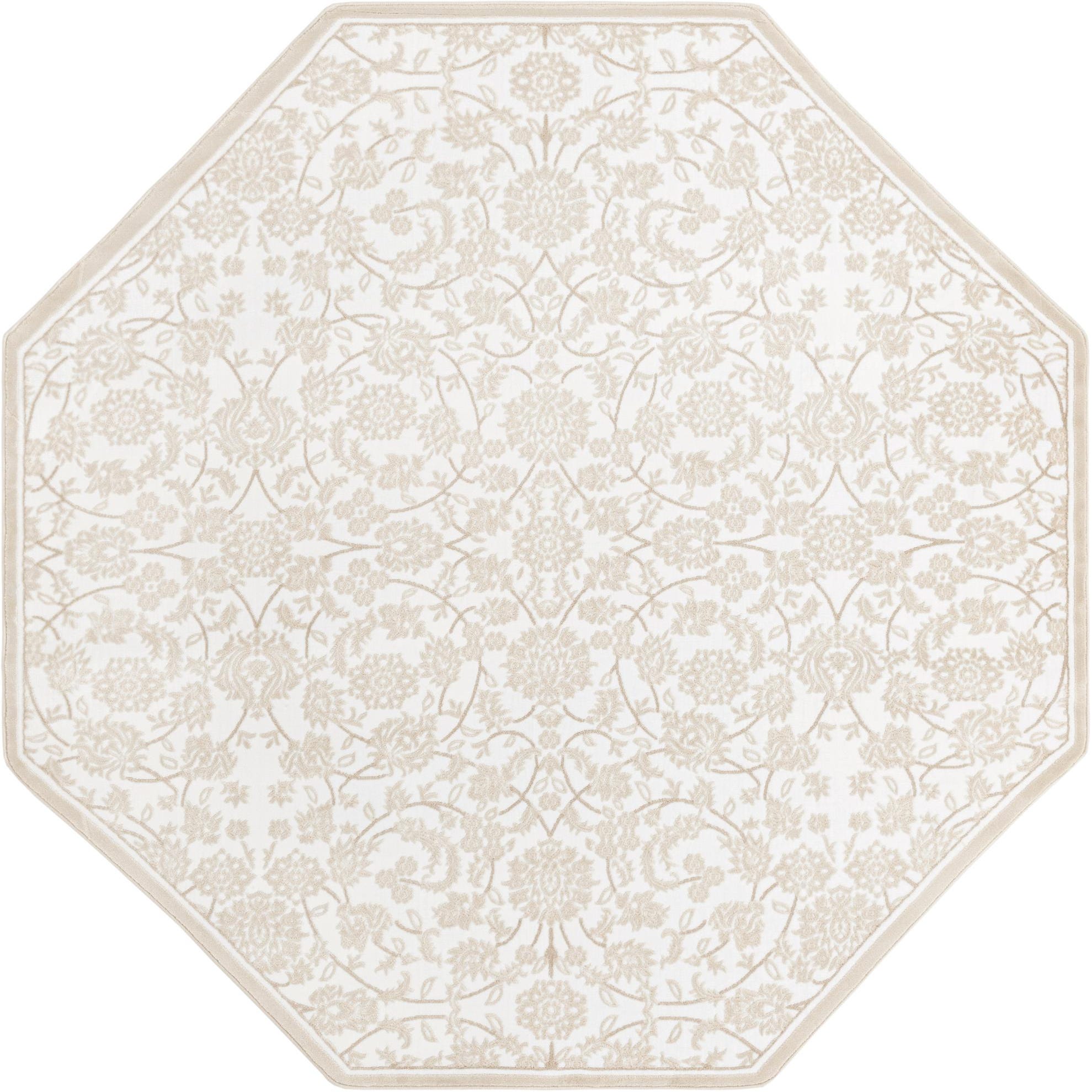 This octagonal area rug pairs a refined floral-and-vine motif with a clean Snow White ground, where beige and light brown tracery form repeating medallions and winding branches across the surface. Machine-made from 55% polypropylene and 45% polyester, the pile is soft to the touch with a low, dense finish that gives the patterned areas a subtle dimensional contrast against the bright background. A narrow border in light brown frames the shape, keeping the overall look restrained and balanced.