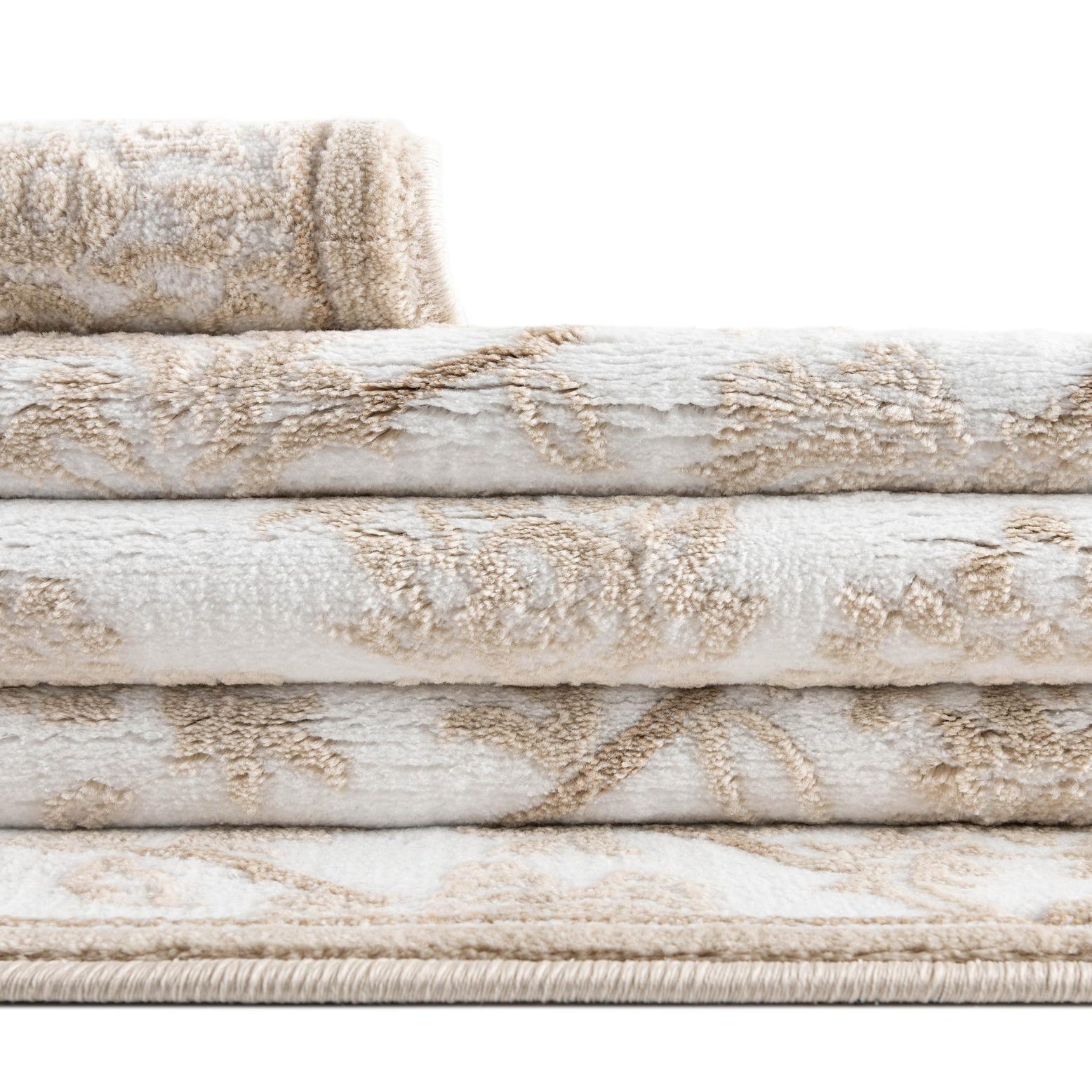 Primary color is Snow White. Colors in this rug include: Snow White, Beige, Light Brown.