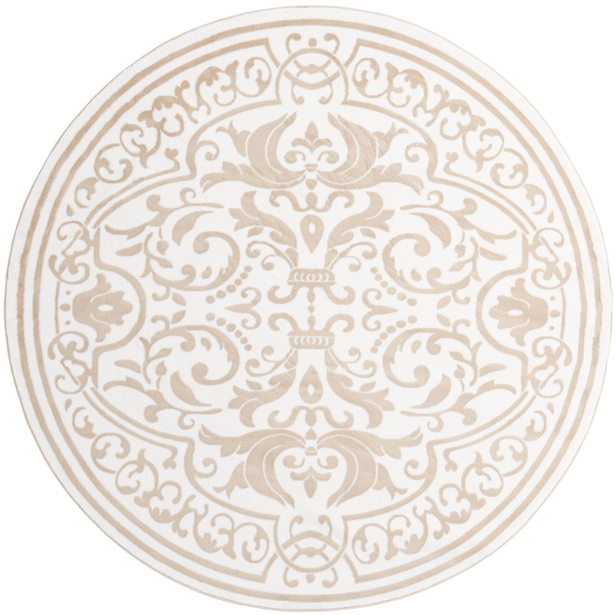 A round 7' 10 x 7' 10 white rug with a detailed beige traditional floral medallion pattern.