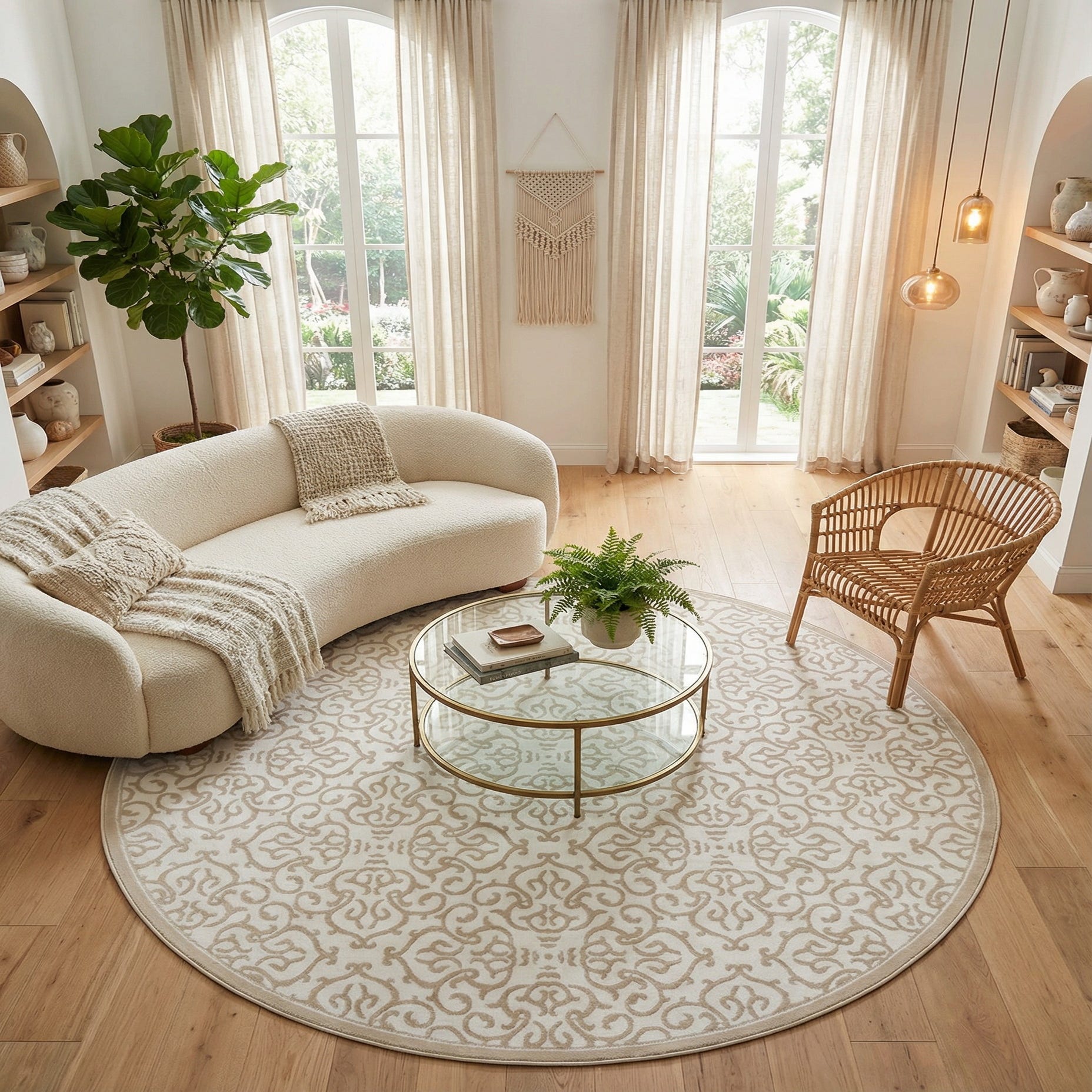 An ornamental filigree medallion pattern in beige and light brown sweeps across a snow white ground, creating a calm, symmetrical design that reads classic yet fresh. Machine-made from 55% polypropylene and 45% polyester, the rug has a low, dense pile with a soft hand; the pattern sits with a gentle, raised contour that adds subtle tactile interest without heavy texture. A narrow, tonal border frames the round shape for a tidy finish.