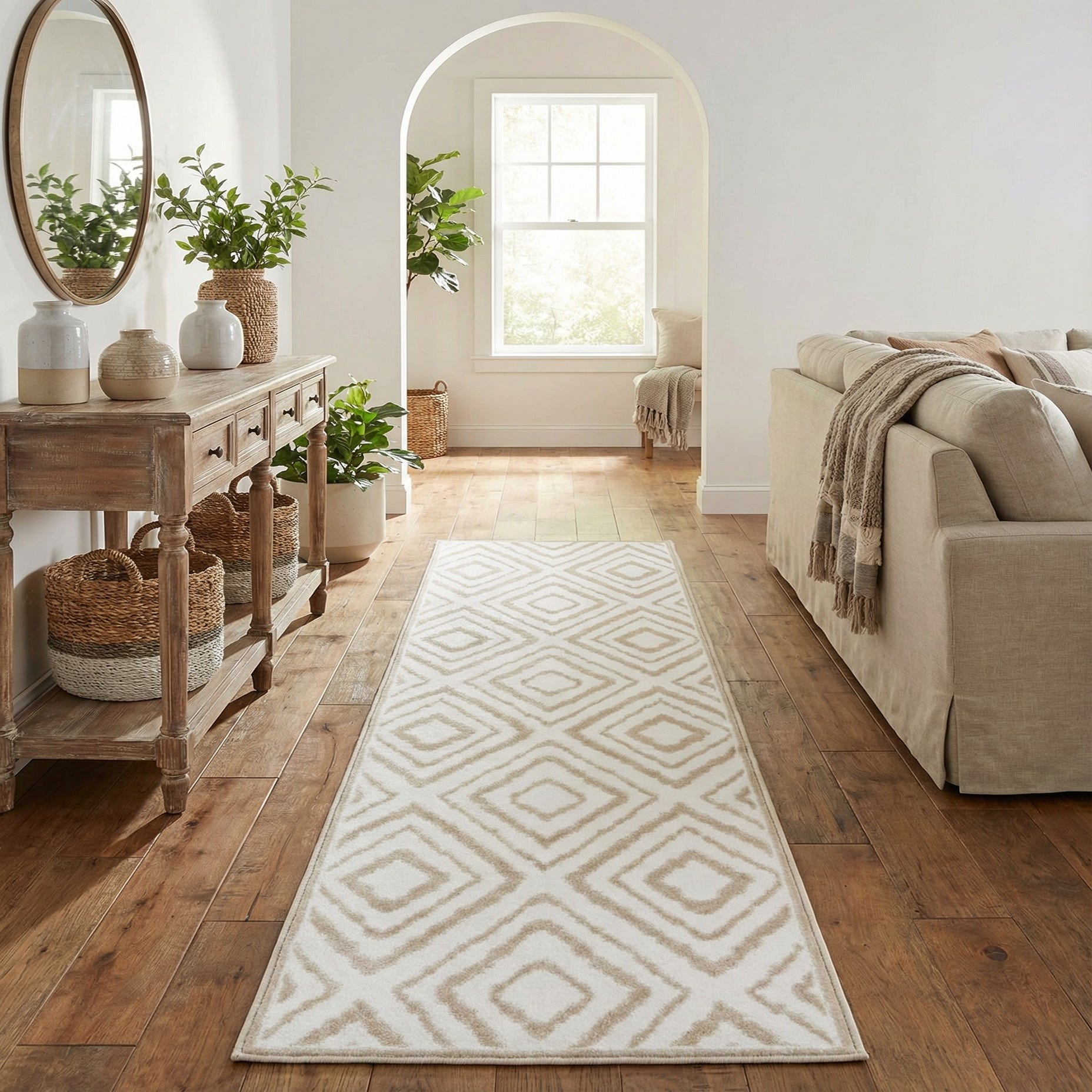 White 8 ft runner rug with a modern geometric diamond pattern in textured beige, ideal for hallways.