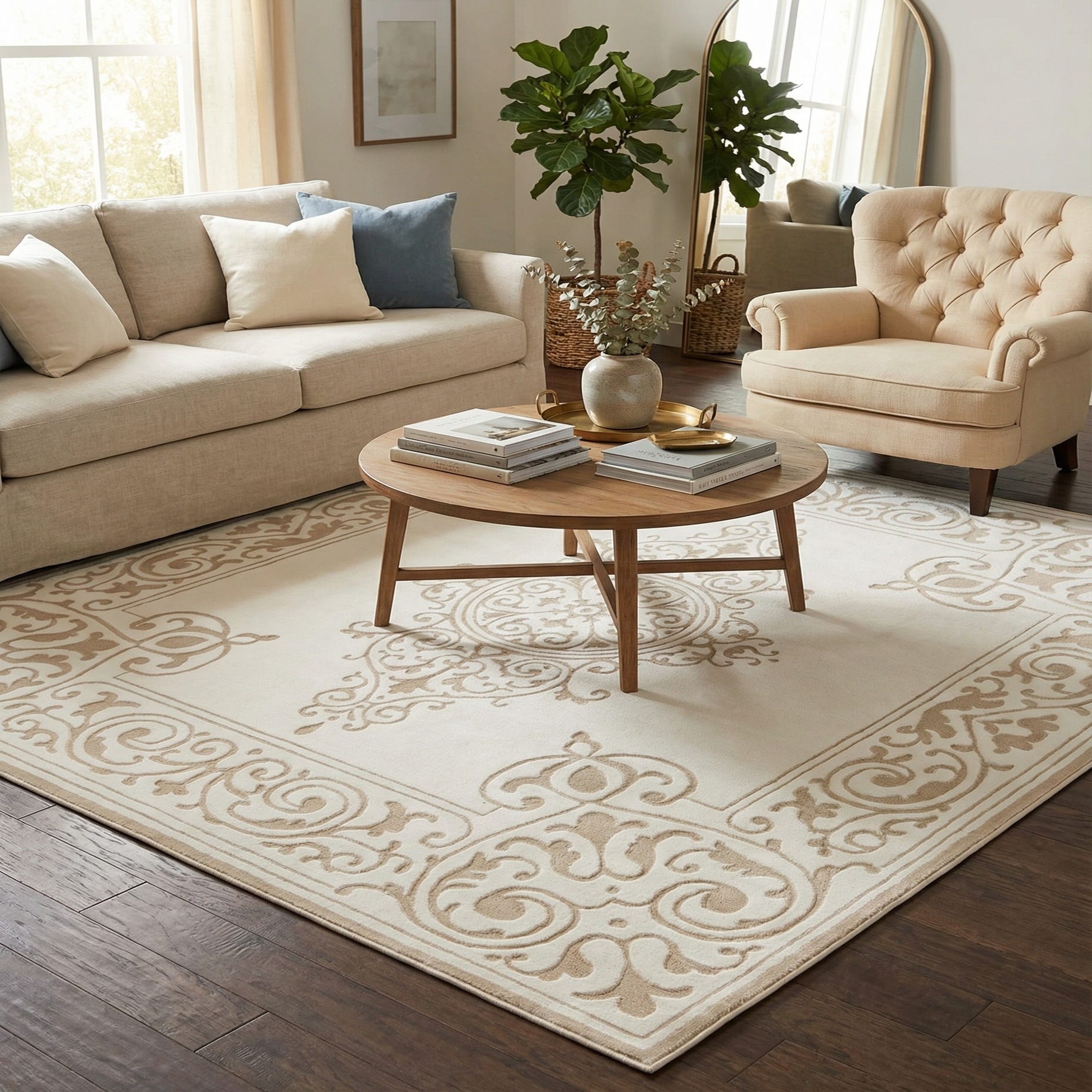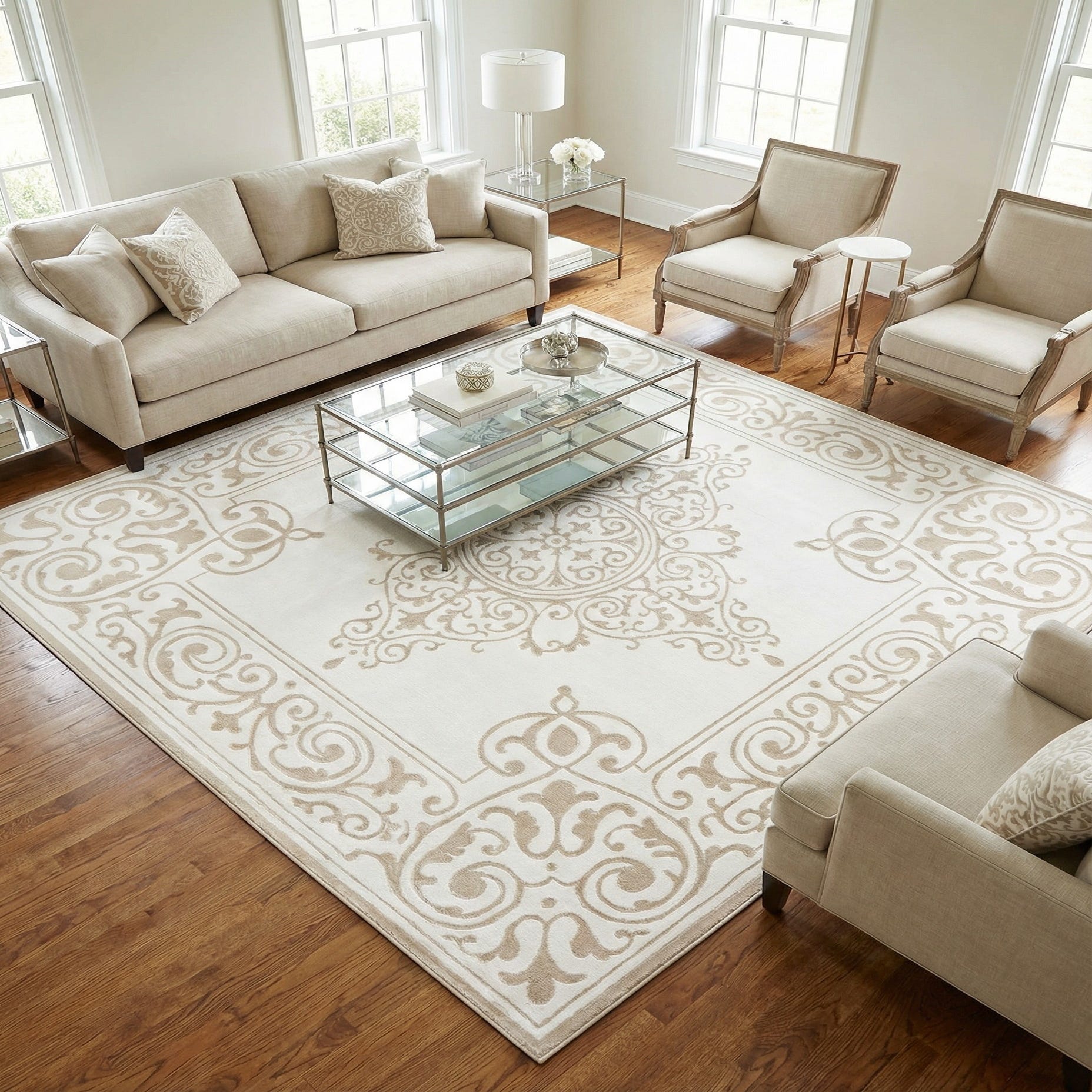This Hermitage collection rug is a seamless blend of contemporary elegance and practical function, designed to enhance a variety of living spaces. Machine-woven from a durable combination of 55% polypropylene and 45% polyester, this 8 ft square rug offers a blend of resilience and softness underfoot. The snow white background provides a crisp canvas for the ornate beige patterning, which features a harmonious medley of scrolling and botanical motifs. This creates a visual dynamic that is both timeless and sophisticated.